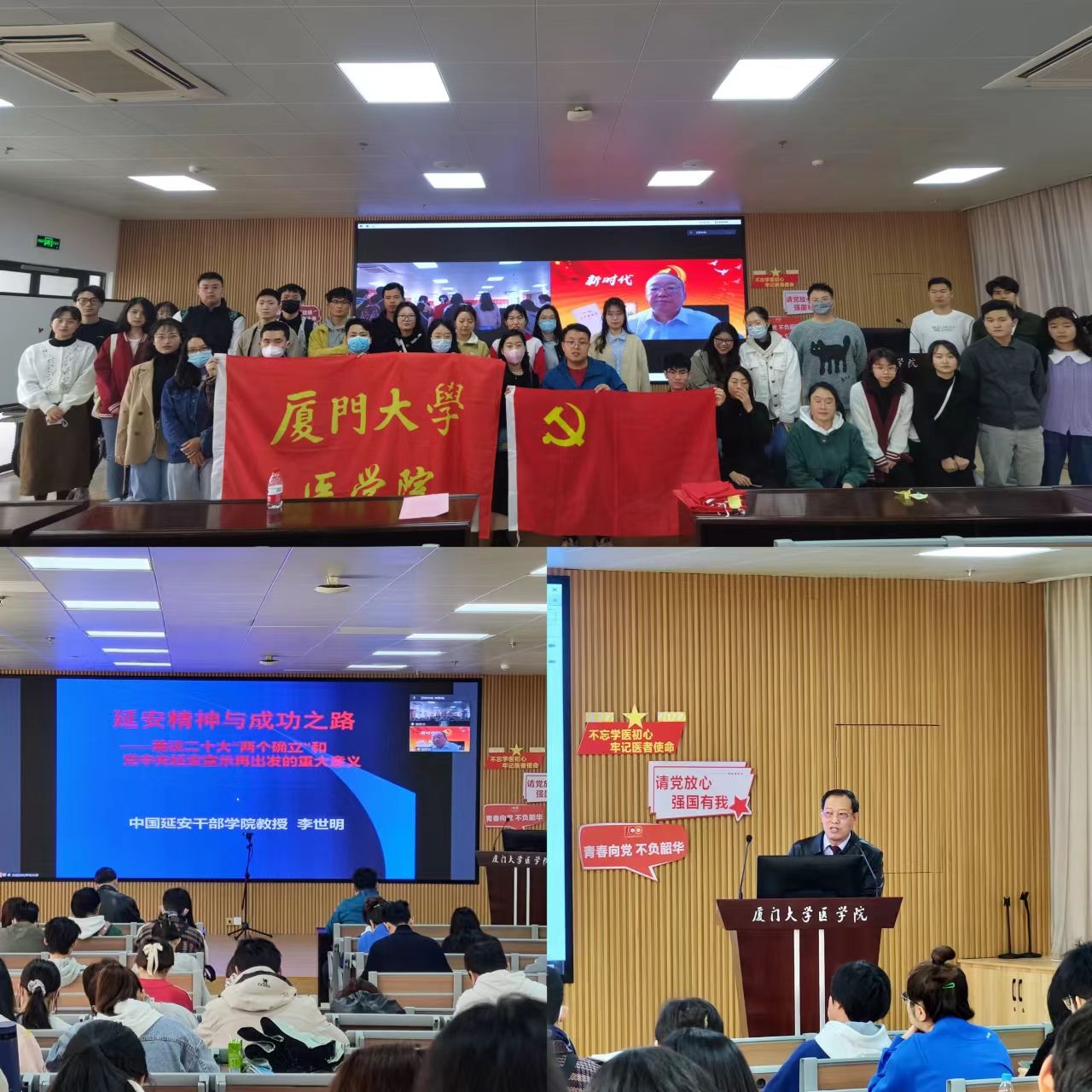 为深入学习贯彻党的二十大精神,加强思政育人和学生党建工作,讲好新学期“开学第一课”。3月4日,学院党委特意邀请中国延安干部学院李世明教授在线上为全院学生党员、团员讲授延安精神与成功之路主题党课,医学院党委委员、副院长李文岗教授,辅导员谢彦贞线下主持本次党课学习活动。