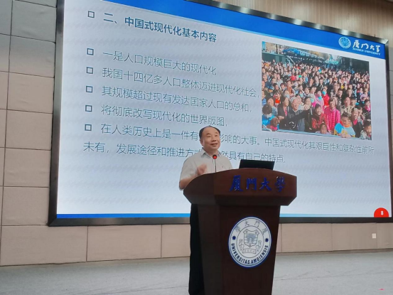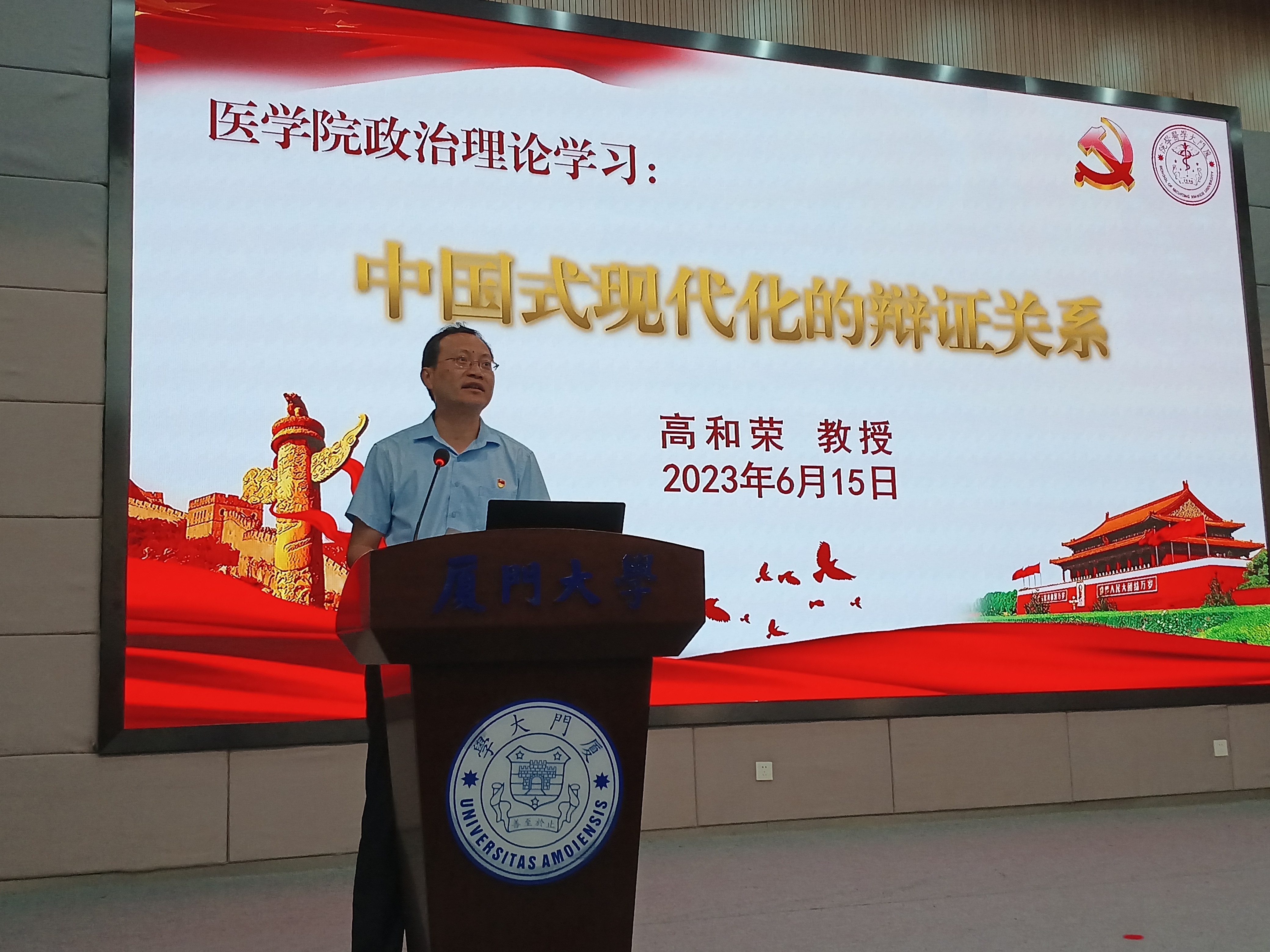 为深入学习贯彻党的二十大精神,6月15日下午,医学院党委邀请校党委宣传部部长高和荣教授在翔安校区德旺图书馆二号报告厅为学院师生作题为《中国式现代化的辩证思想》专题报告。报告会由学院党委书记李峰主持。校医管办党支部、翔安校区办公室党支部、学生工作部(处)第三党支部和医学院教职工及部分学生代表参加报告会。