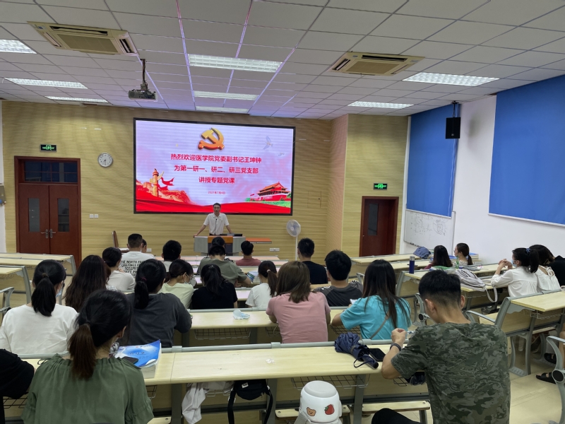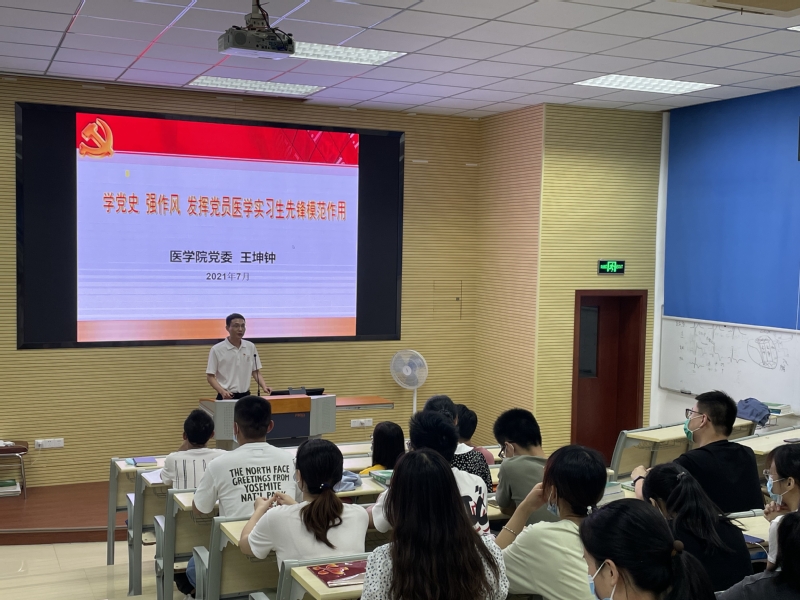 为庆祝中国共产党成立100周年,进一步加强党史学习教育,加强和改进党的作风建设,根据《中共中央关于在全党开展党史学习教育的通知》《厦门大学党史学习教育实施方案》等文件精神,7月4日晚,医学院党委副书记王坤钟于第一医院科研教学楼401为第一医院研究生第一、第二、第三党支部全体党员、入党积极分子讲授 “学党史、强作风,发挥党员先锋模范作用”专题党课。本次专题党课由医学院研究生辅导员、第一医院研究生第一党支部书记许丽婷主持。