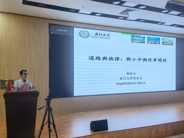 讲座伊始,刘诗古以《春天的故事》这首耳熟能详的歌曲引入,带领在座师生们共同阅读“中国南海边的诗篇”。随后,刘诗古从“如何认识邓小平在改革开放关节点上所做的抉择”和“如何认识邓小平改革开放总设计师的历史地位”两个问题展开,以生动的语言和详实的历史资料,讲述了邓小平同志领导中国共产党和全国各族人民开创改革开放伟大事业的历史贡献,总结了中国改革开放的背景和经验,指出了改革开放在党百年奋斗历程中的历史性意义。