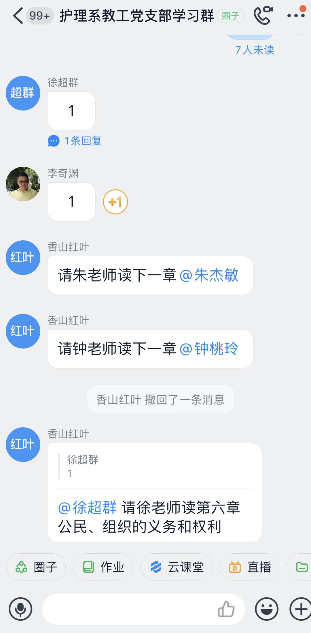 本次专题学习的内容包括《中华人民共和国国家安全法》《全国人民代表大会关于建立健全香港特别行政区维护国家安全的法律制度和执行机制的决定》和《人民日报》7月1日发表的《坚持以总体国家安全观为指导 全面深入推进国家安全法治建设》的文章。护理系教工党支部书记沈曲老师强调大家要深刻理解总体国家安全观,在工作生活中,时刻保持警惕,绷紧国家安全的弦,同一切危害国家安全的行为作斗争,维护国家安全利益。通过宣传国家安全法,引导教工遵守宪法、法律法规关于国家安全的有关规定,保守国家秘密,及时报告危害国家安全活动的线索,共同维护国家安全。会后大家线上线下交流了学习的心得体会,大家纷纷表示,国家安全仅关乎国家利益,更关系到每个公民的切身利益,在生活中我们要保持敏感性,照片不能任性拍、网络攻击要防范、发表言论要谨慎,从生活的点滴做起,维护国家安全。本次活动线上采用钉钉直播的形式,也得到了大家的积极响应和配合,线上线下认真学习、积极交流、沟通无障碍。