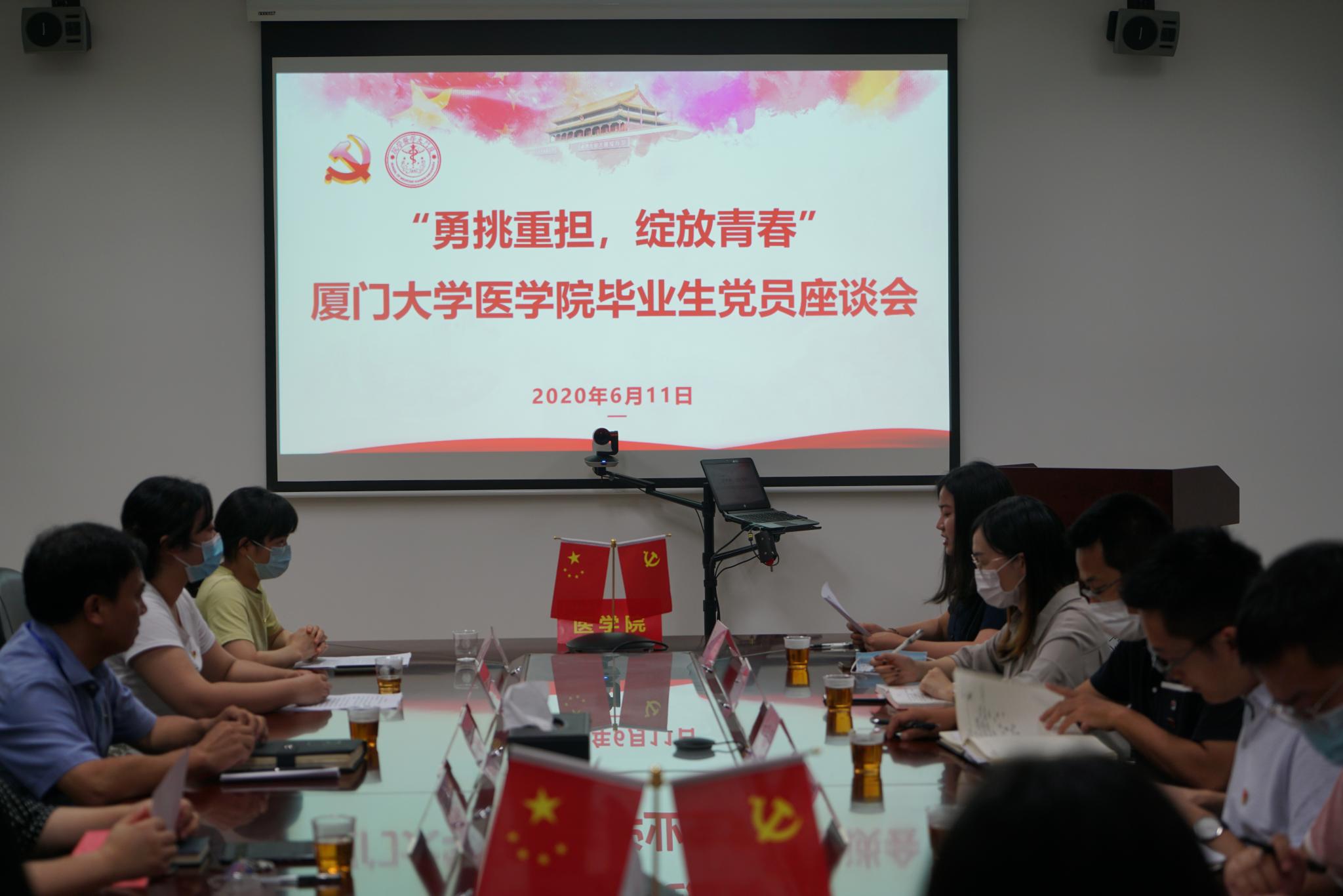6月11日晚,OD网页版,OD(中国)在爱礼楼103会议室举行以“勇挑重担,绽放青春”为主题的毕业生党员教育座谈会。附属翔安医院急诊医学科援鄂护师张楠,医学院校友、弘爱医院重症医学科医师王琳,医学院党委书记张建安、党委副书记何丽苹,毕业班辅导员、党务秘书及毕业生党员代表参加了会议,同时向全院380余名学生党员开放线上直播。会议由研究生毕业生党员吴涵主持。