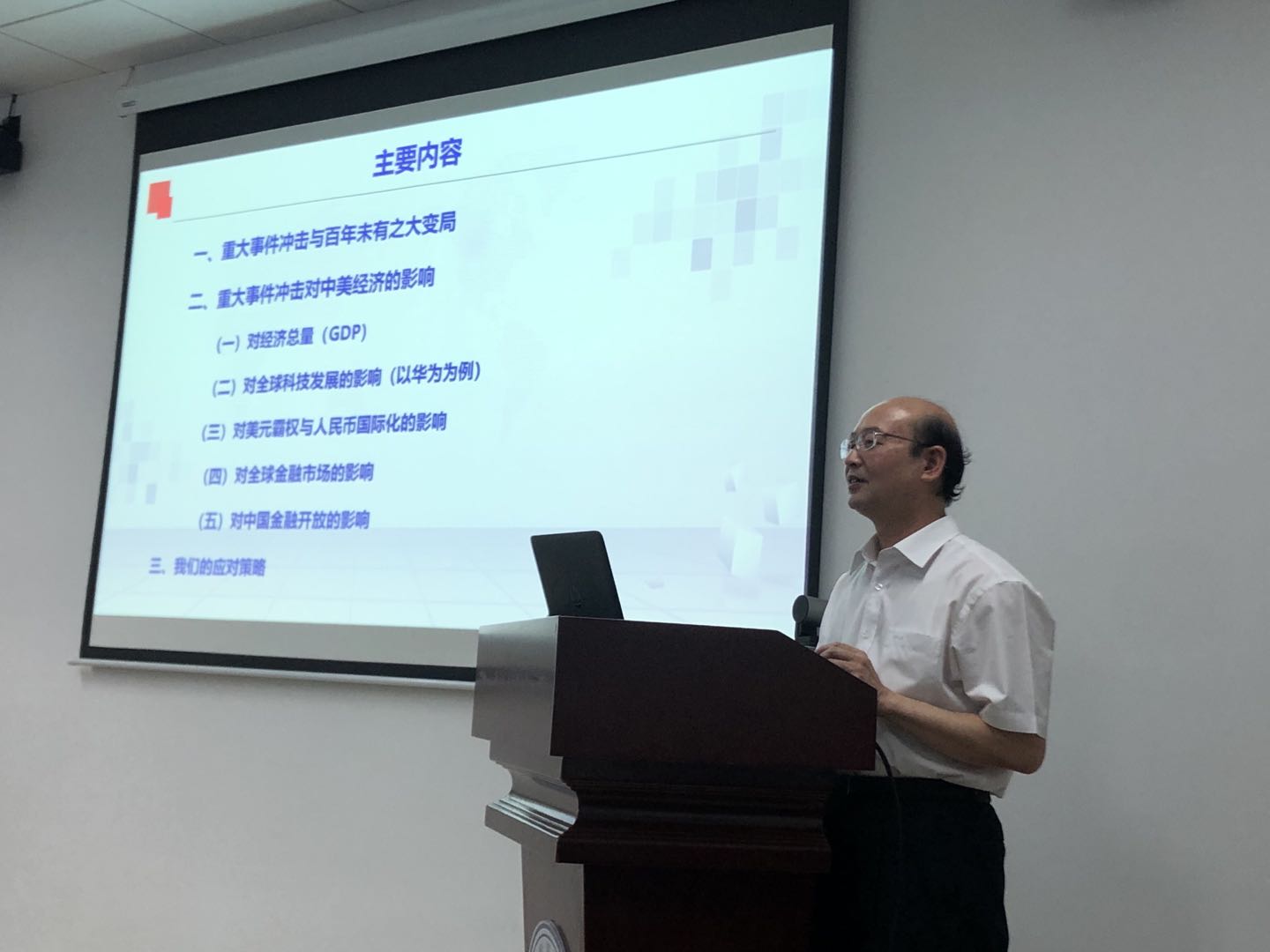 朱孟楠教授从重大事件冲击与百年未有之大变局、重大事件冲击对中美经济的影响、我们的应对策略三个方面展开,通过详实的数据对比,深入阐述了新冠肺炎疫情对经济总量(GDP)、对全球科技发展的影响(以华为为例)、对美元霸权与人民币国际化的影响、对全球金融市场的影响和对中国金融开放的影响。他建议我们应当把握韬光养晦、登高望远、有所作为、合作共赢的原则,在经济、技术、人才、体制机制中部署重点举措,中国世纪是大势所趋、不可阻挡,我们要对未来充满信心。