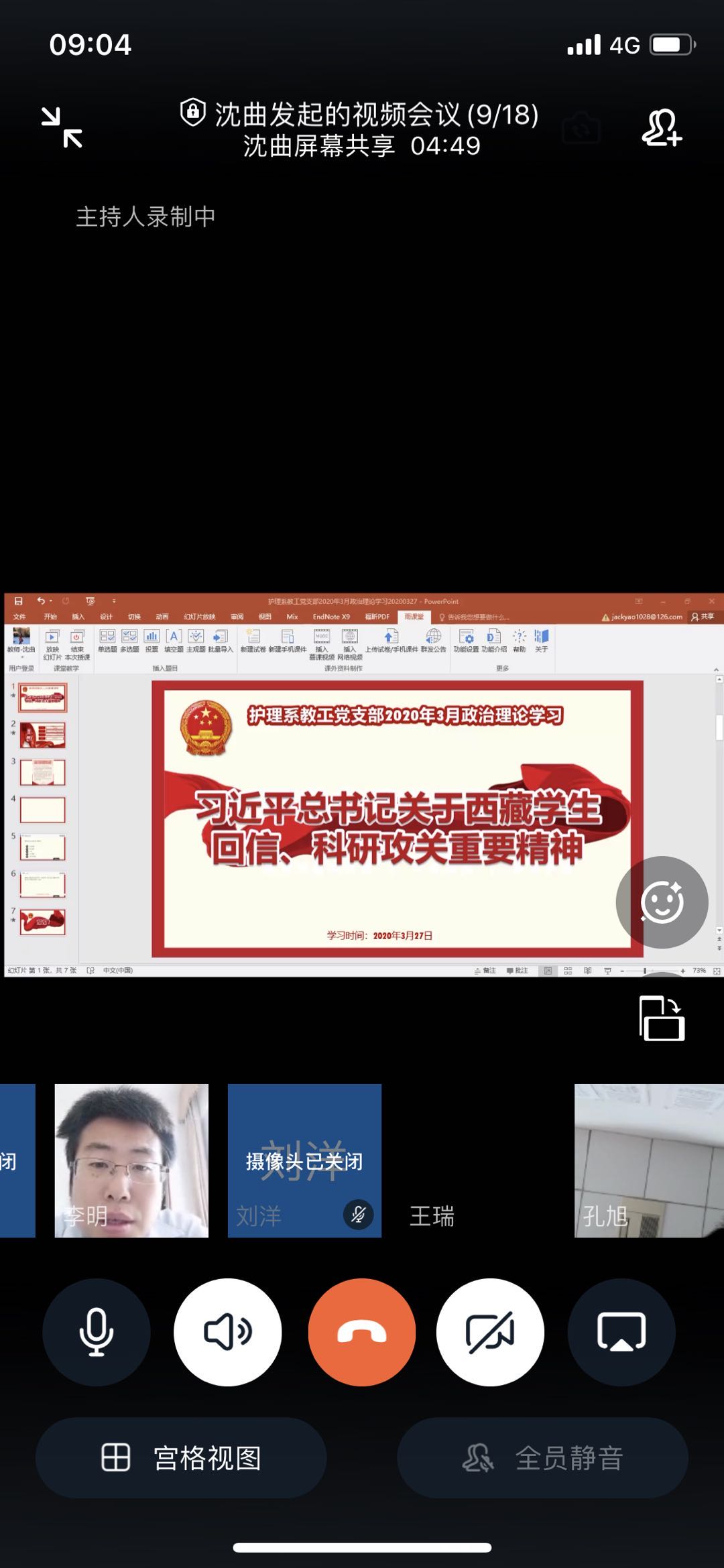 首先,支部学习活动的前一天支部书记沈曲老师把习近平总书记关于西藏学生回信、科研攻关重要精神的学习资料分享在学习群里,支部成员先进行自学;其次,活动当天大家根据支部书记沈曲老师分享的二维码邀请进群参加钉钉线上会议,伴随着沈老师的精心准备的PPT展示在钉钉会议屏幕上,全体成员领会了《关于开展2020年3月政治理论学习的通知》和《习近平在北京考察新冠肺炎防控科研攻关工作时强调协同推进新冠肺炎防控科研攻关为打赢疫情防控阻击战提供科技支撑》的文件精神,深入学习了《中共教育部党组关于学习贯彻习近平总书记给在首钢医院实习的西藏大学医学院学生重要回信精神的通知》的文件内容,同时配合雨课堂进行提问与讨论,全体成员热情响应,高度配合,积极的参加到学习中,值得一提的是“钉钉”和“雨课堂”的搭配使用让远程会议增添了灵动感和趣味性。