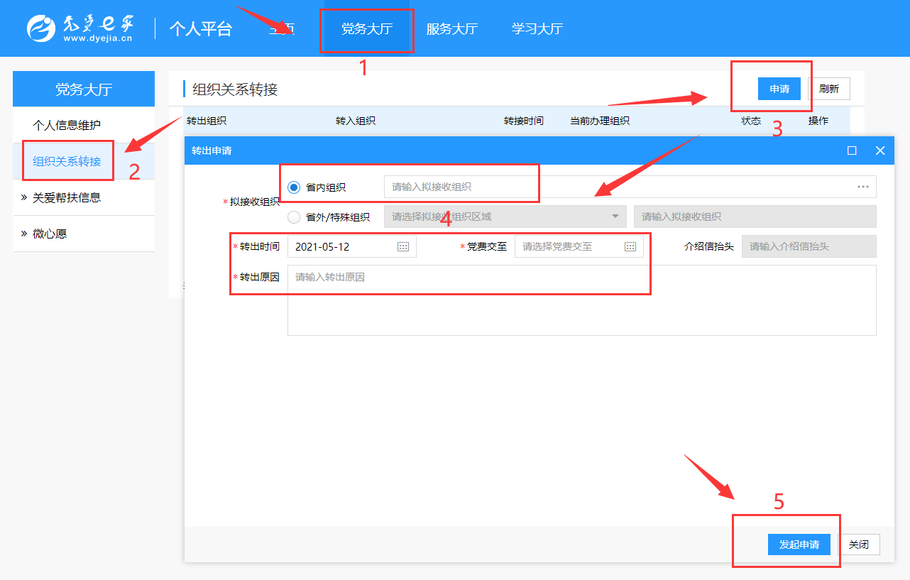 党员登录“党员e家”平台(www.dyejia.cn)→点击“登录”→登录个人平台→进入“党务大厅”→选择“组织关系接转”→点击“申请”→选择“省内组织”→填写拟接收党支部名称(中共OD网页版,OD(中国)2021级研究生支部委员会)→填写其他转出信息→点击“发起申请”,等待党组织逐级审批。如下图所示。