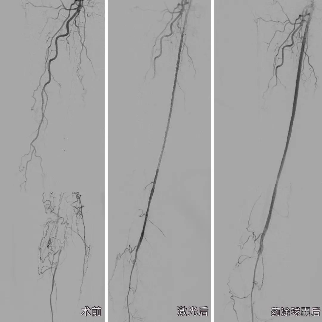 经过完善的术前准备,庄晖主任率团队在患者大腿的动脉,穿刺了一个仅绿豆般大小的口子,将激光导管从小洞中引入到堵塞的血管中,用准分子激光进行开通。仅是激光消蚀减容还不够,医生又使用了药物涂层球囊,通过球囊扩张,将一种防止内膜增生的药物涂到血管内壁上,从而达到长期抑制血管再狭窄的效果,“通俗来说,就是起到防止血管内再长‘水垢’的作用。”