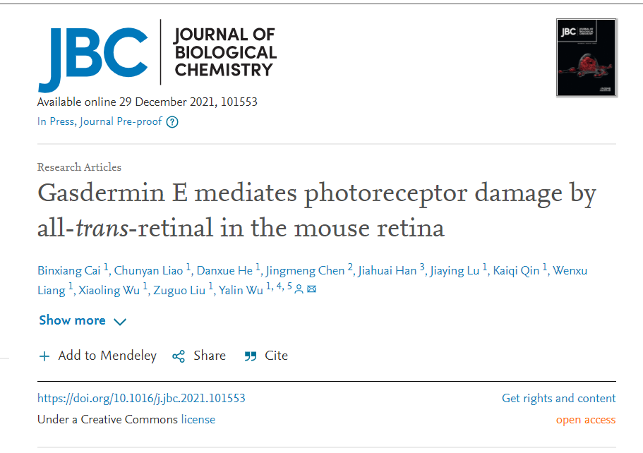 2021年12月29日,老牌主流期刊《Journal of Biological Chemistry》在线发布了吴亚林教授课题组的最新研究成果“Gasdermin E mediates photoreceptor damage by all-trans-retinal in the mouse retina”。该论文揭示了成孔蛋白Gasdermin E在视黄素代谢紊乱诱发感光细胞退化中的作用及其机制,为干性AMD和STGD1治疗提供了新靶点。