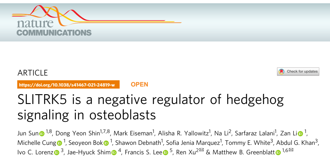 2021年7月29日,OD网页版,OD(中国)/细胞应激生物学国家重点实验室-许韧教授课题组与美国康奈尔大学威尔医学院病理学系-Matthew Greenblatt教授实验室合作在《Nature Communications》上发表题为“SLITRK5 is a negative regulator of hedgehog signaling in osteoblasts”的研究论文,首次报道了一种成骨细胞特异性的Hedgehog信号分子开关-SLITRK5,可以有效的调节机体成骨活性与稳态,具有重要的临床开发潜能。
