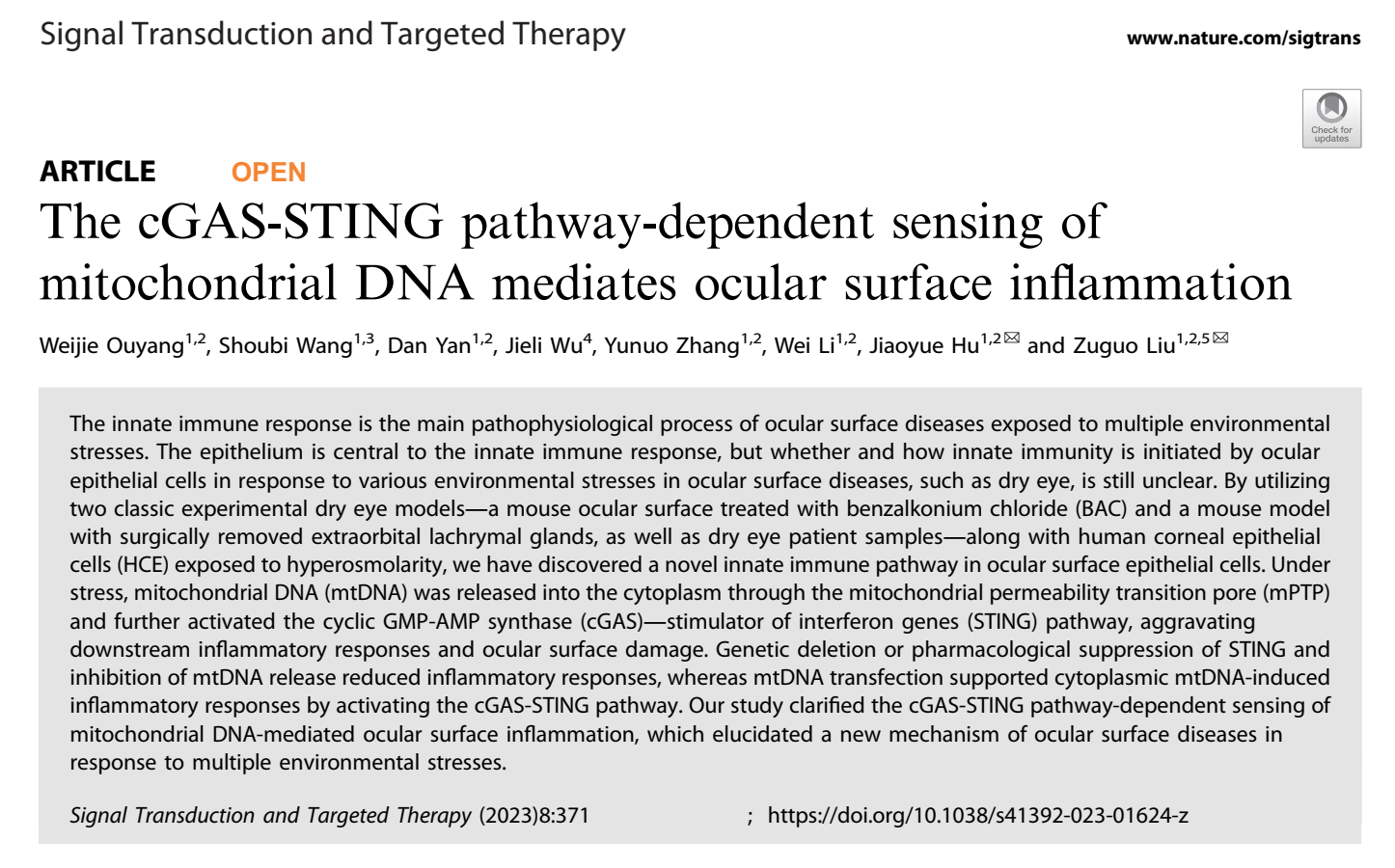 近日,厦门大学眼科研究所在Signal Transduction and Targeted Therapy杂志(IF=39.3)发表题为“The cGAS-STING pathway-dependent sensing of mitochondrial DNA mediates ocular surface inflammation”的研究论文。该研究发现,多种外界刺激可以导致角膜上皮细胞线粒体功能障碍和线粒体膜通透性转换孔(mPTP)的开放,使得线粒体DNA(mtDNA)泄漏进入胞质中,进而激活cGAS-STING信号通路从而介导眼表炎症。