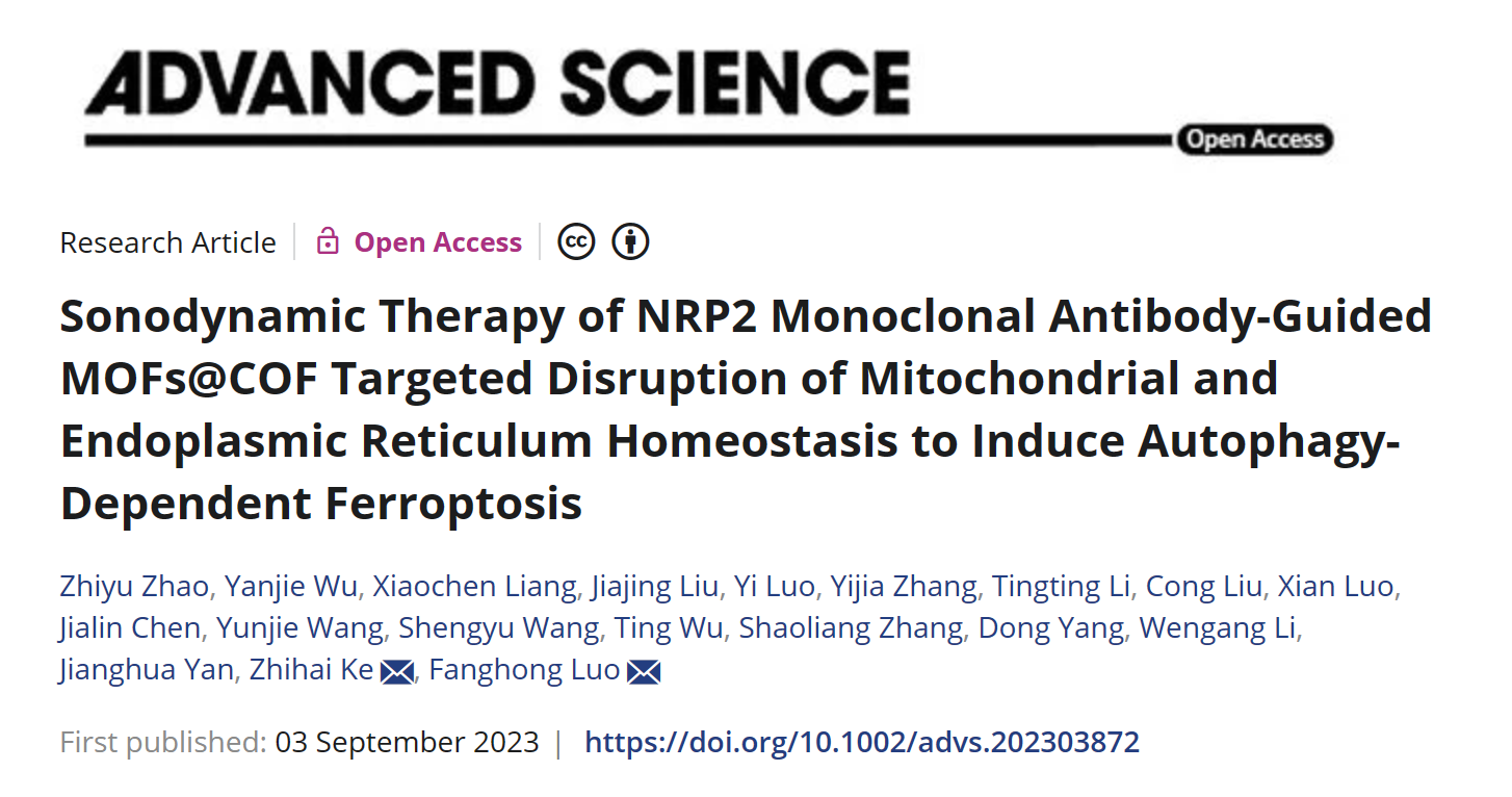 2023年9月3日,OD网页版,OD(中国)抗癌研究中心罗芳洪课题组与香港中文大学(深圳)柯志海课题组合作,在国际著名综合性期刊Advanced Science发表了题为“Sonodynamic Therapy of NRP2 Monoclonal Antibody-Guided MOFs@COF Targeted Disruption of Mitochondrial and Endoplasmic Reticulum Homeostasis to Induce Autophagy-Dependent Ferroptosis”的研究论文。论文报道了一种新型载药纳米笼MOFs@COF,可特异结合NRP2受体靶向聚集于胰腺癌组织,通过声动力效应产生单态氧破坏肿瘤细胞线粒体和内质网稳态从而诱导自噬依赖性铁死亡,并增加胰腺癌细胞对吉西他滨的敏感性,可望为耐药肿瘤的靶向治疗提供一种新思路。