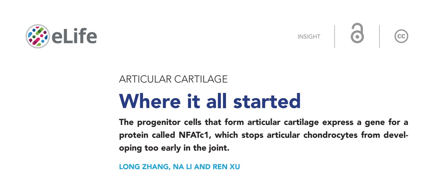 2023年4月,我院许韧教授受eLife科学出版社(eLife Sciences Publications)邀请,在其发行的国际知名刊物《eLife》上撰写题为“Where it all started: The progenitor cells that form articular cartilage express a gene for a protein called NFATc1, which stops articular chondrocytes from developing too early in the joint.”的评论文。针对同期发表在《eLife》上的相关研究论文“NFATc1 marks articular cartilage progenitors and negatively determines articular chondrocyte differentiation”(https://doi.org/10.7554/eLife.81569)进行了专题评论。eLife作为中科院一区、国际著名生物学综合期刊,创办于2011年6月,由美国霍华德休斯医学研究所、德国马普学会和英国的Wellcome Trust基金会3家机构共同出资创立。