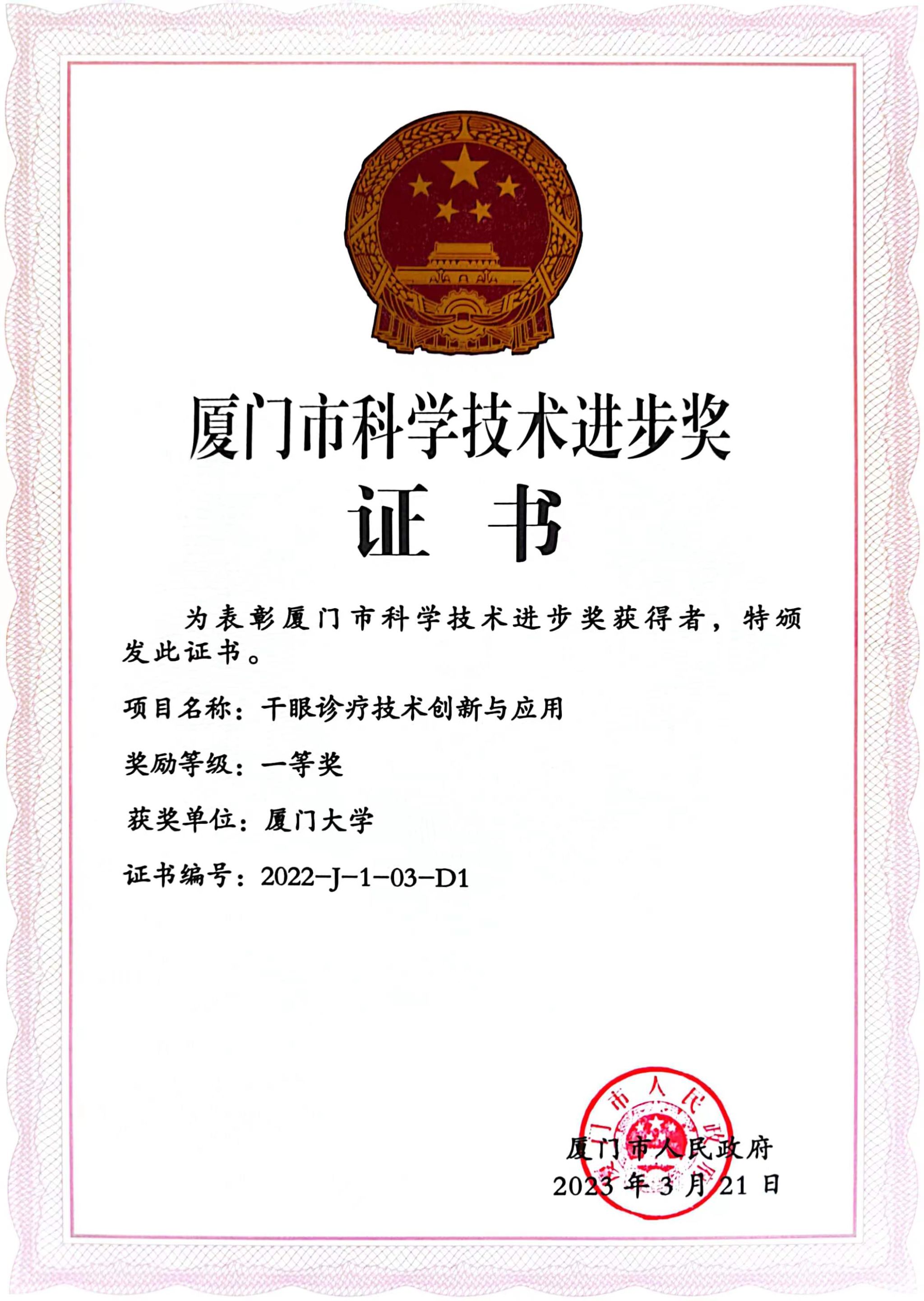 近日,厦门市公布了2022年度科学技术进步奖获奖名单,厦门大学眼科研究所刘祖国教授团队研发项目——《干眼诊疗技术创新与应用》荣获2022年度厦门市科技进步一等奖。