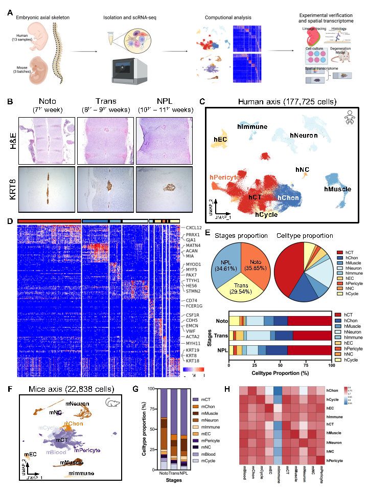 中轴骨骼系统在日常生活运动中保护着我们的身体,由椎体、椎间盘(Intervertebral disc, IVD)以及附着的肌腱/韧带和肌肉组织组成。IVD为相邻椎体之间的连接,主要负责维持中轴骨的机械稳定性,由位于中央起源于脊索(Notochord,NC)的髓核(Nucleus pulposus,NP)、环绕的纤维环 (Annulus fibrosus,AF)及两端与椎体相邻的终板(Endplate,EP)组成。早期IVD形成的标志性改变是脊索向髓核的转变,而脊索细胞的减少与IVD退变的发生密切相关。近期虽然有多个单细胞转录组测序研究分别描绘了人类和小鼠成体IVD的细胞异质性和分子特征。然而,目前尚缺乏胚胎早期椎间盘形成的时空转录调控图谱,尤其是脊索向髓核转变过程中的细胞异质性与调控分子网络仍未阐明。