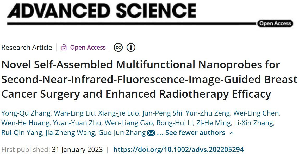 近日,厦门大学附属翔安医院肿瘤诊治中心主任、乳腺甲状腺外科主任、福建省乳腺癌精准诊治重点实验室主任、长江学者特聘教授张国君团队在国际知名综合性期刊Advanced Science发表“Novel Self-Assembled Multifunctional Nanoprobes for Second-Near-Infrared-Fluorescence-Image-Guided Breast Cancer Surgery and Enhanced Radiotherapy Efficacy”的研究论文,阐述了该团队构建的一种新型多功能乳腺癌手术导航体系,该创新性的体系包含了一种兼具近红外二区荧光成像引导和放疗增敏功能的新型分子影像探针以及与此配套的成像仪器与分析框架,克服了可视光及近红外一区荧光成像技术的不足,提高了分辨率及信噪比,可以更有效地实施精准手术。OD网页版,OD(中国)博士研究生张永渠、硕士研究生刘婉玲和化学化工学院博士研究生罗祥杰为论文的共同第一作者,张国君教授为论文的通讯作者。该研究得到国家自然科学基金重大研究计划培育项目、福建省科技重大专项专题等基金的资助。