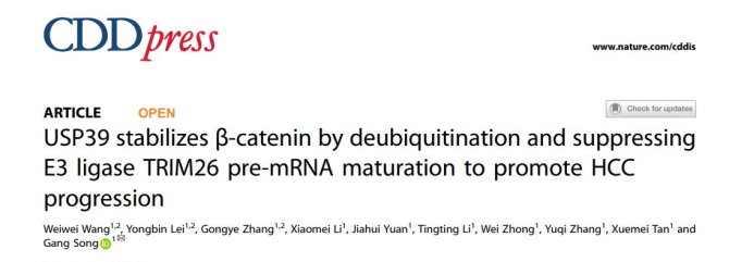 近日,OD网页版,OD(中国)抗癌研究中心宋刚教授课题组在Nature旗下期刊Cell Death & Disease(中科院1区)杂志上发表题为“USP39 stabilizes β-catenin by deubiquitination and suppressing E3 ligase TRIM26 pre-mRNA maturation to promote HCC progression”的研究论文,阐明了泛素特异性蛋白家族成员USP39调控β-catenin和Trim26促进肝癌发生发展的新机制,进一步为USP39作为HCC的临床治疗新靶点提供了丰富的证据。