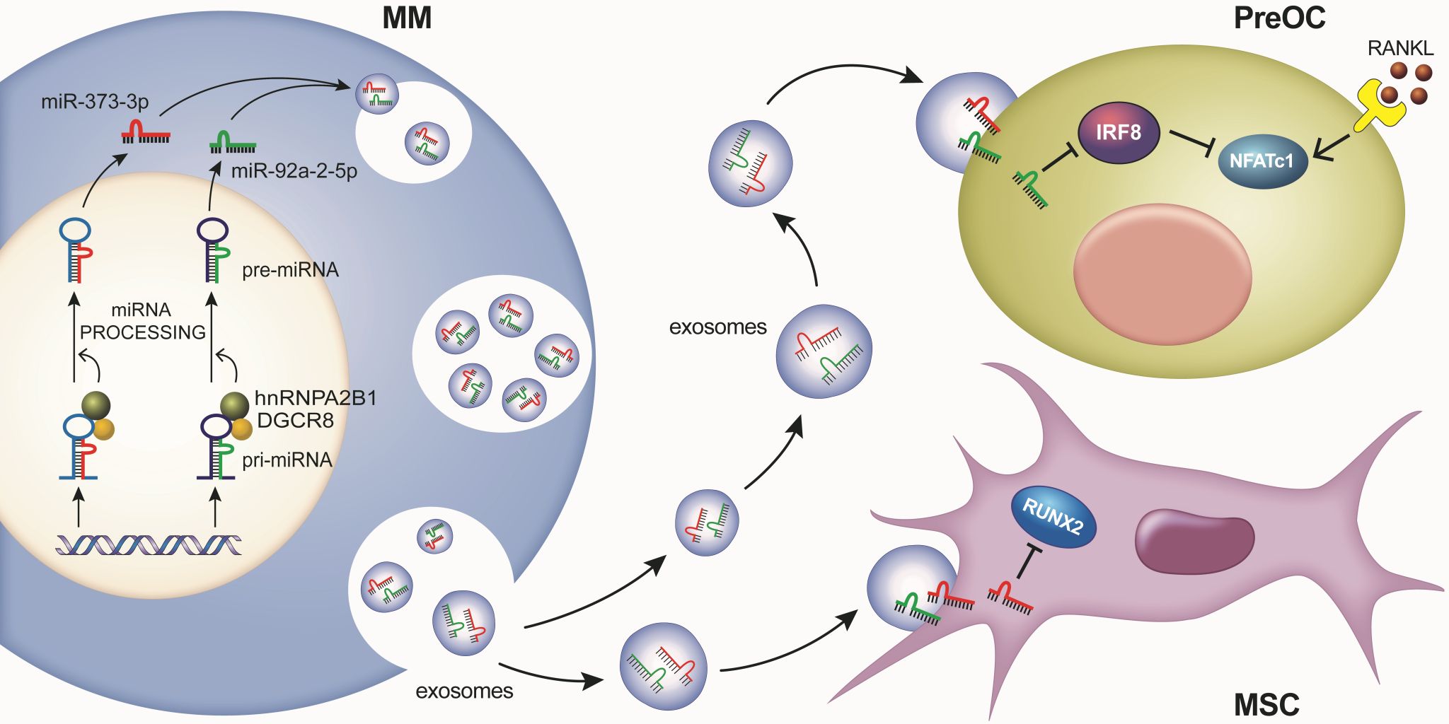 RNA甲基化修饰(N6-methyladenosine, m6A)是真核生物RNA最广泛存在的修饰类型。在本项工作中研究团队发现RNA甲基化识别蛋白异质核核糖核蛋白A2B1(hnRNPA2B1)在骨髓瘤细胞中高表达,同时在骨髓瘤患者中,有骨损伤组骨髓瘤细胞hnRNPA2B1的表达水平显著高于无骨损伤组。进一步的分子机制研究发现,骨髓瘤细胞hnRNPA2B1与DGCR8形成复合体,通过调控RNA甲基化的方式促进miRNA(miR-92a-2-5p和miR-373-3p)的加工和成熟,而成熟的miRNA被外泌体包裹进入间充质干细胞和前破骨细胞。在前破骨细胞中,miR-92a-2-5p抑制了转录因子IRF8的表达,从而解除了IRF8对NFATc1的抑制,进而促进破骨细胞分化成熟;在间充质干细胞中,miR-373-3p抑制了转录因子RUNX2的表达,从而抑制成骨细胞的分化。另外,动物实验表明m6A抑制剂或miRNA抑制剂显著抑制了骨髓瘤细胞诱导的骨损伤。以上结果表明hnRNPA2B1是治疗骨髓瘤骨损伤的一个非常有潜力的靶点。