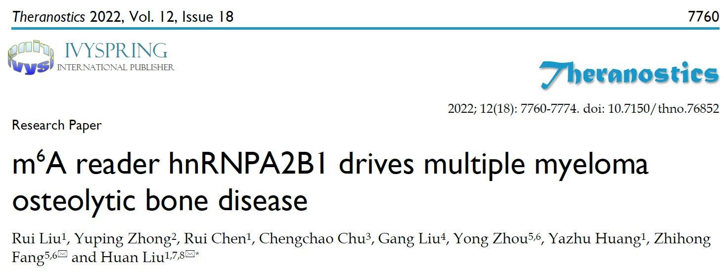近日,抗癌研究中心刘欢教授课题组与附属第一医院方志鸿副教授合作在探索骨髓瘤细胞诱导溶骨性骨损伤分子机制方向取得新进展,相关工作成果以题为“m6A reader hnRNPA2B1 drives multiple myeloma osteolytic bone disease”发表于《Theranostics》。