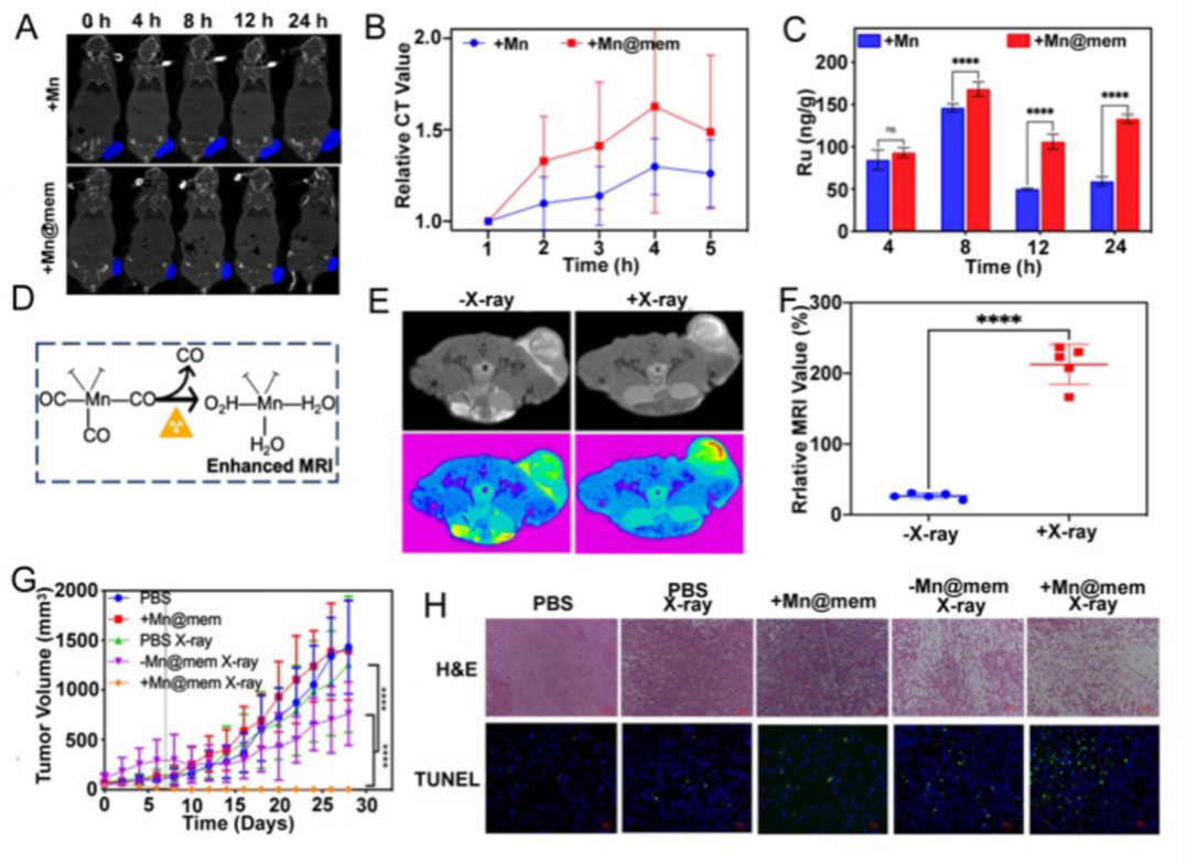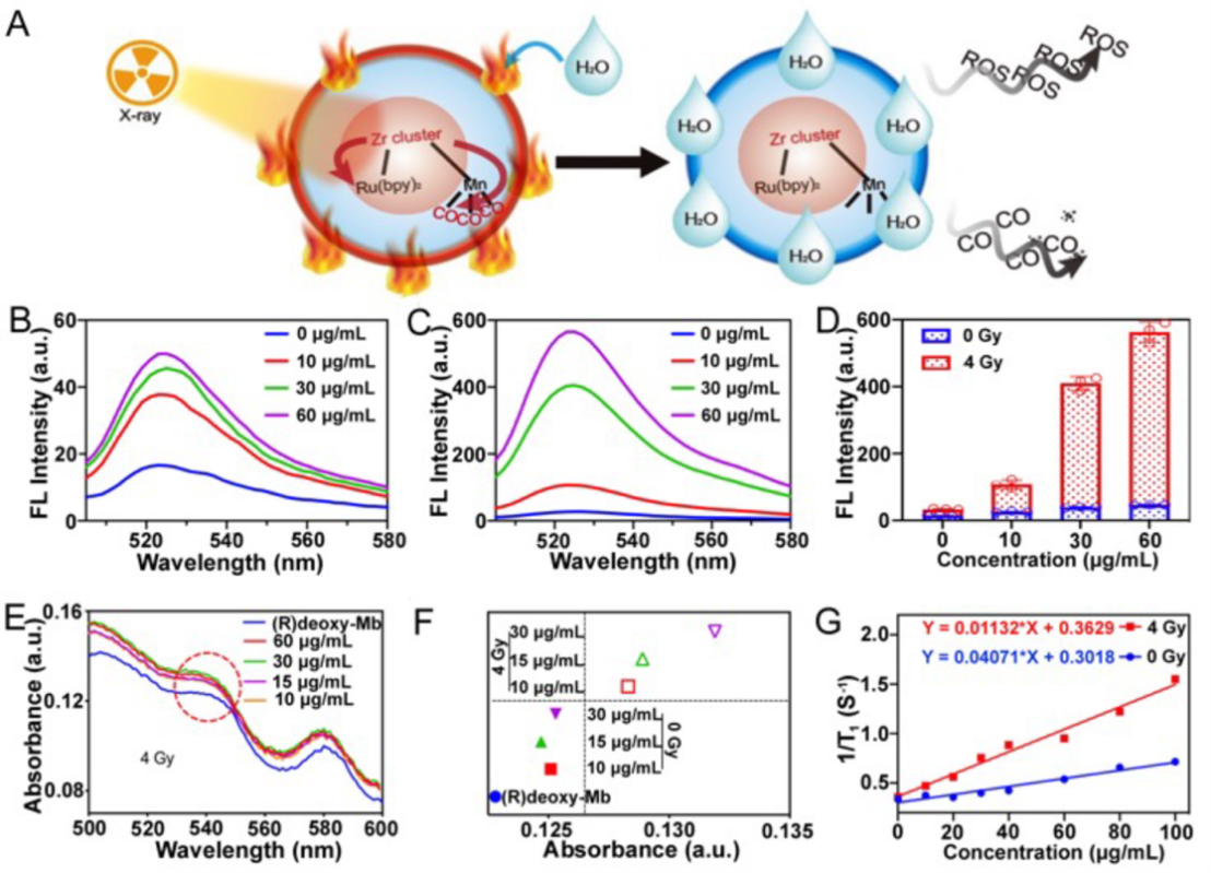 本课题研发了一种基于钌的金属-有机纳米结构放疗增敏剂(ZrRuMn-MONs@mem),通过在X射线诱导的动力学疗法(XDT)中最大化ROS的产生和一氧化碳(CO)治疗气体的释放来优化放疗。此外,随着CO的释放,MRI成像性能也得到显著增强,实现诊疗一体化效果的提高(图1)。