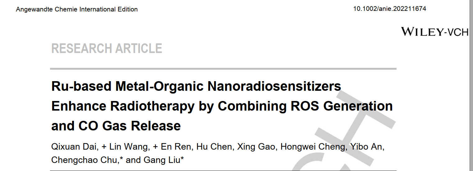 近日,医学院眼科研究所楚成超副教授和公共卫生学院刘刚教授合作在化学领域国际顶级期刊Angew Chem Int Edit在线刊发了题为“Ru-based Metal-Organic Nanoradiosensitizers Enhance Radiotherapy by Combining ROS Generation and CO Gas Release”的研究成果。