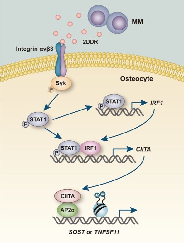 在发表于《Nature Communications》工作中,研究团队关注骨髓瘤重编程骨细胞在骨损伤中的作用。骨细胞长期以来被认为只是机体的支持细胞,其在肿瘤微环境中的作用多年来鲜有报道。研究团队发现骨细胞在骨髓瘤细胞的重编程下获得了诱导骨损伤的能力。结果表明骨髓瘤细胞代谢产物2-脱氧-D-核糖(2-deoxy-D-ribose, 2DDR)通过激活骨细胞Syk-STAT1-IRF1信号轴促进MHC II类反式激活蛋白(major histocompatibility complex class II transactivator, CIITA)表达,该蛋白具有组蛋白乙酰化转移酶活性,CIITA招募转录因子AP2α形成转录激活复合体,上调溶骨性细胞因子RANKL和sclerostin启动子区域组蛋白H3第14位赖氨酸乙酰化(H3K14ac),进而激活二者的表达引起骨损伤。这种骨细胞乙酰化的修饰在完全缓解骨髓瘤动物模型中仍然存在,特异性敲除骨细胞CIITA可以显著减少骨髓瘤小鼠模型的骨损伤。这些结果提示被修饰的骨细胞是导致完全缓解患者骨损伤不能恢复的重要原因之一,该工作是关于骨髓瘤细胞与骨细胞耦合作用的重要发现。