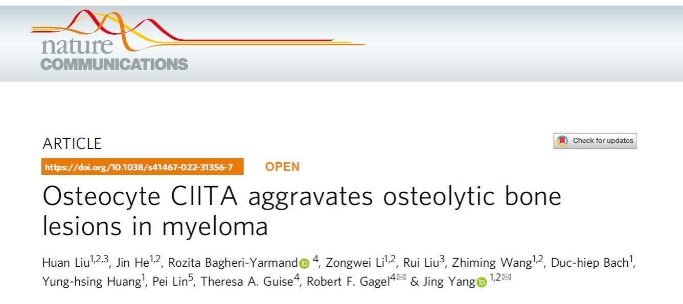 近日,抗癌研究中心刘欢教授课题组在探索骨髓瘤细胞诱导溶骨性骨损伤分子机制方向取得系列新进展,相关工作成果分别以题为“Osteocyte CIITA aggravates osteolytic bone lesions in myeloma”和“Bacterial infections exacerbate myeloma bone disease”发表于高水平期刊《Nature Communications》和《Journal of Translational Medicine》。