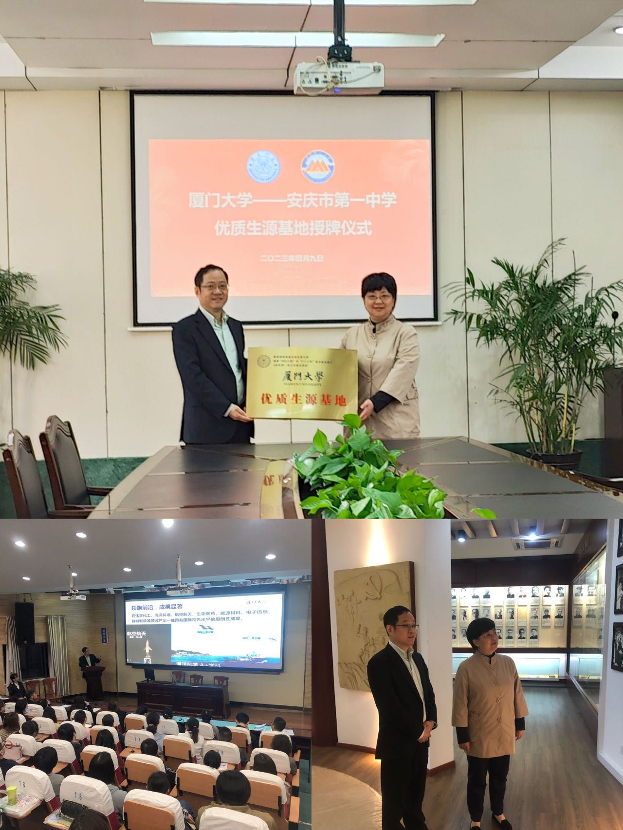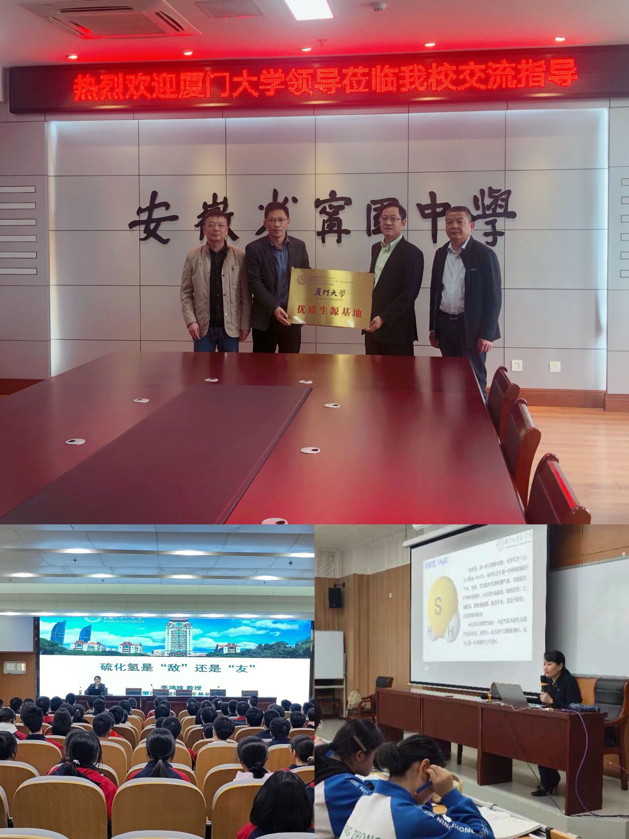 4月9日至11日,厦门大学安徽招生宣传组赴安徽省安庆市、宣城市、宁国市开展招生宣传活动。本次安徽招生宣传组由医学院副院长李炜教授带队,李鸿珠教授、团委宋磊华老师、教务办陈竞萌老师三人随行。宣传组一行人分别走访了安徽省安庆第一中学、宣城中学、宁国中学等三所重点中学。安庆一中校长、宣城中学校长、宁国中学副校长分别带领所在中学教师代表,与我校招生宣传组开展座谈会,接受“厦门大学优质生源基地”授牌,并积极组织学生参加招生宣讲会和“教授进中学”讲座。接访中学热情地欢迎我校前来开展招生宣传工作,纷纷表示厦门大学是考生向往的最美大学,希望在未来的工作中,继续紧密交流,向厦门大学输送更多更好的优质生源,共同推进为党育人、为国育才工作。