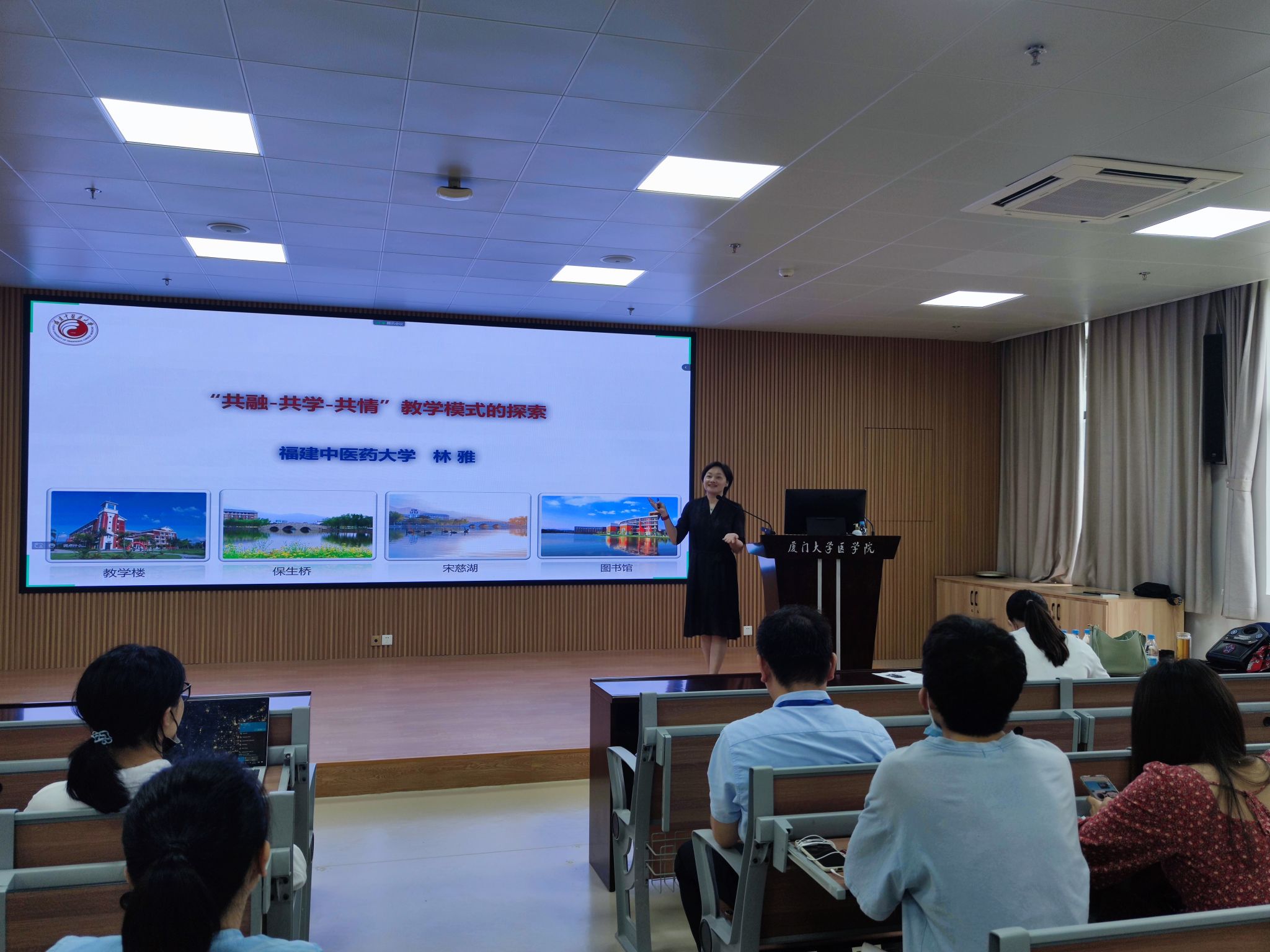 会上,学院特邀了福建中医药大学药学院林雅教授来我院开展“‘共融-共学-共情’药理学教学模式的探索与实践”专题讲座。林教授从新医科视角分享了自己所负责的国家级一流本科生课程《药理学》的教学设计与改革实践,引入学生中心、产出导向、持续改进的教学理念,让学生从入学开始就像医生一样思考问题。同时,还着重强调如何深入挖掘课程中的思政教育元素,科学设计课程思政教育体系。林雅教授在课程设计中提出“共融-共学-共情”的创新思路,即重塑教学内容让知识更新融合、设计教学案例让思想碰撞教学相长、突显价值导向让课堂教学有温度有真情。