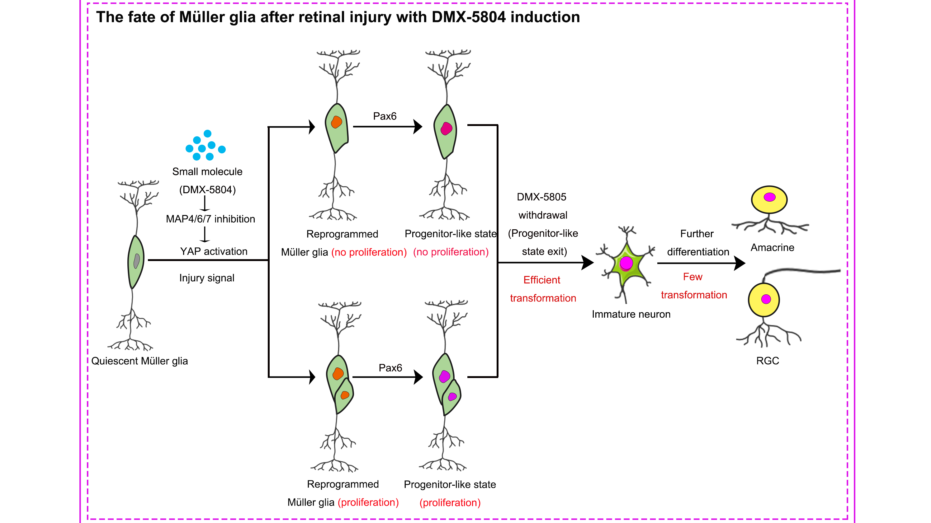 在该项研究中,研究人员发现小鼠视网膜损伤模型中MAP4Ks被激活,使穆勒细胞中的YAP被磷酸化滞留于细胞质中无法发挥功能。采用可以同时靶向MAP4K4、MAP4K6和MAP4K7的小分子药物DMX-5804腹腔注射处理损伤小鼠,发现该小分子可以通过血-视网膜屏障进入视网膜抑制MAP4Ks,促进YAP入核并调控穆勒细胞进入细胞周期,同时表达视网膜前体细胞的标志物Pax6,提示YAP的激活可以促进哺乳动物穆勒细胞去分化为视网膜前体细胞。在小分子药物处理停止后,穆勒细胞来源的视网膜前体细胞可以分化为无长突细胞和神经节细胞,补充受损的神经元。在NMDA/DMX-5804处理30天后,采用视觉电生理的方法对小鼠进行视觉功能评估,可以观察到神经节细胞功能与单纯NMDA处理小鼠相比有明显的改善。这一发现为采用小分子药物促进视网膜再生,治疗视网膜损伤致盲疾病带来了希望。