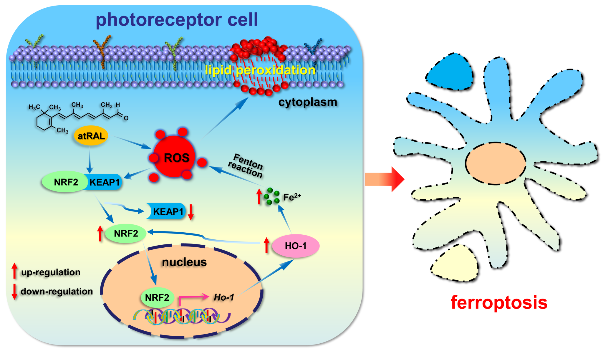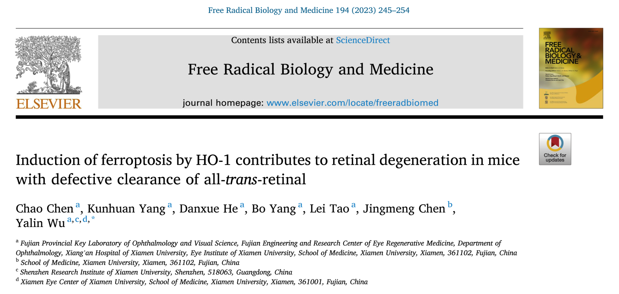 2022年12月12日,自由基与医学领域国际权威期刊《Free Radical Biology and Medicine》(JCR一区,影响因子8.101)在线发布了吴亚林教授课题组的最新研究成果“Induction of ferroptosis by HO-1 contributes to retinal degeneration in mice with defective clearance of all-trans-retinal”。该论文揭示了血红素加氧酶-1 (HO-1),也称为热休克蛋白32(HSP32),在视觉循环紊乱诱发光感受器和视网膜色素上皮(RPE)退化中的作用及其机制,有望为治疗干性AMD和STGD1提供一种新型潜在靶点。该论文的第一作者为陈超博士(医学院2017级毕业生,现为华侨大学讲师),通讯作者为吴亚林教授。