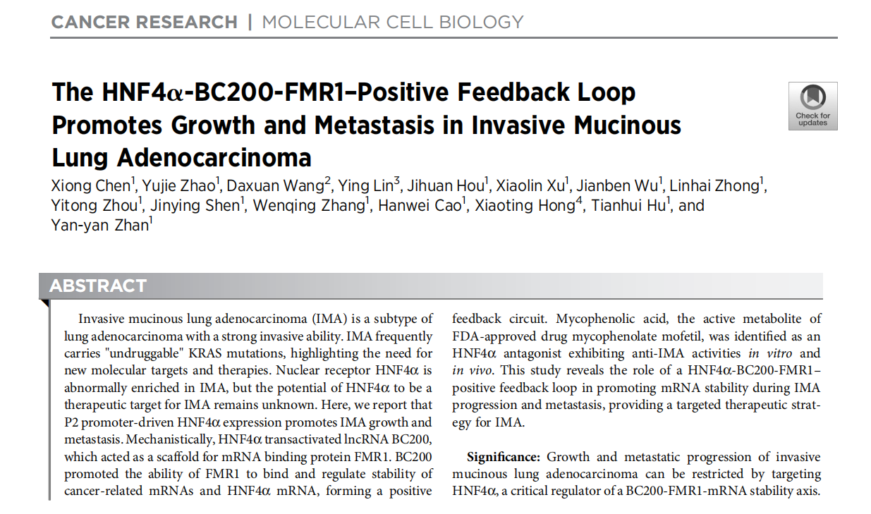 2021年12月1日,国际权威肿瘤学杂志Cancer Research(IF=12.701)在线发表了厦门大学抗癌研究中心占艳艳副教授团队的最新研究成果“The HNF4α-BC200-FMR1 positive feedback loop promotes growth and metastasis in invasive mucinous lung adenocarcinoma”。该论文揭示了核受体HNF4α在浸润性黏液型肺腺癌(invasive mucinous lung adenocarcinoma,IMA)生长和转移过程中的作用及相关分子机制,并从FDA批准上市药物库筛选到能有效抑制IMA生长和转移的新型HNF4α拮抗剂,为IMA治疗提供新靶点和策略。