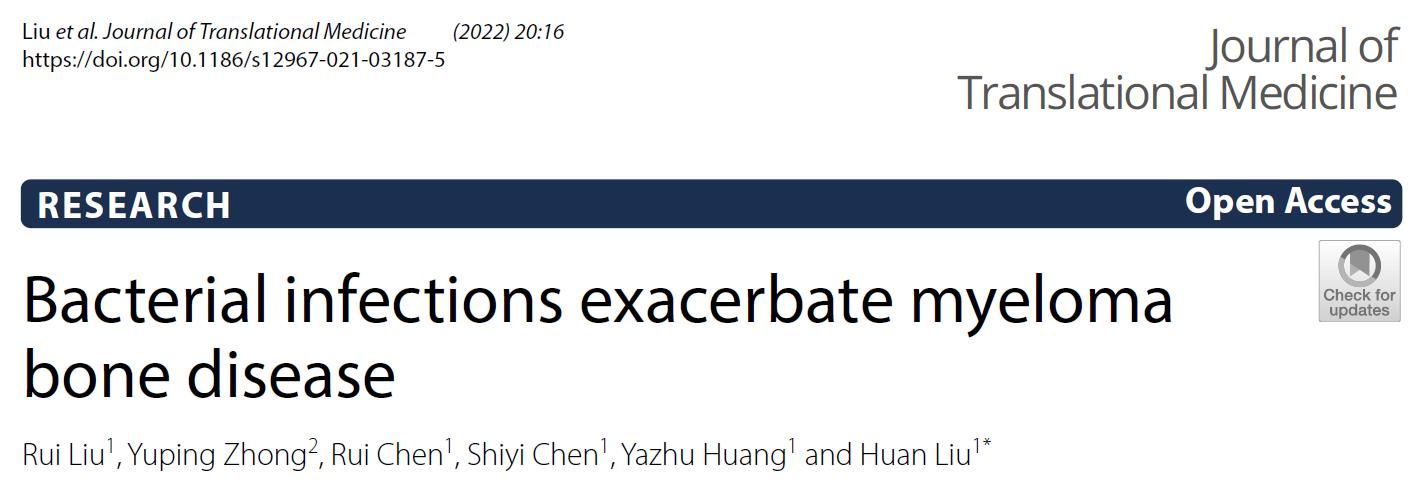近日,抗癌研究中心刘欢教授课题组在探索骨髓瘤细胞诱导溶骨性骨损伤分子机制方向取得系列新进展,相关工作成果分别以题为“Osteocyte CIITA aggravates osteolytic bone lesions in myeloma”和“Bacterial infections exacerbate myeloma bone disease”发表于高水平期刊《Nature Communications》和《Journal of Translational Medicine》。