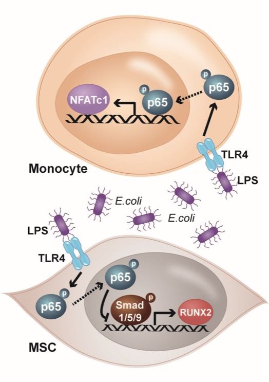 在发表于《Journal of Translational Medicine》工作中,研究团队关注骨髓瘤患者急性细菌感染和骨损伤的相关性。急性细菌感染是骨髓瘤的首发病症,也是骨髓瘤主要的死亡原因之一。研究团队发现无论是新诊断患者还是完全缓解患者的骨髓腔中均存在大量的大肠杆菌,而正常人骨髓腔中并没有发现。近年来有不少重量级的成果证明肠道微生物参与了肿瘤的进展和免疫,但是对于骨髓腔细菌感染在完全缓解患者骨损伤中的作用却仍然未知。大肠杆菌可以通过其细胞膜上的脂多糖(Lipopolysaccharide, LPS)和单核细胞(Monocyte)Toll 样受体4(Toll-like receptors 4, TLR4)结合,激活p65-NFATc1信号轴促进破骨细胞分化,LPS也可以和间充质干细胞(MSC)表面的TLR4受体结合,激活p65通路,抑制Smad1/5/9蛋白与RUNX2的启动子结合,抑制RUNX2基因转录,进而抑制成骨细胞分化。该工作诠释了另外一种完全缓解骨髓瘤患者骨损伤仍然不能恢复的原因,提出抗生素治疗可以有效促进缓解期骨髓瘤患者骨损伤的愈合。