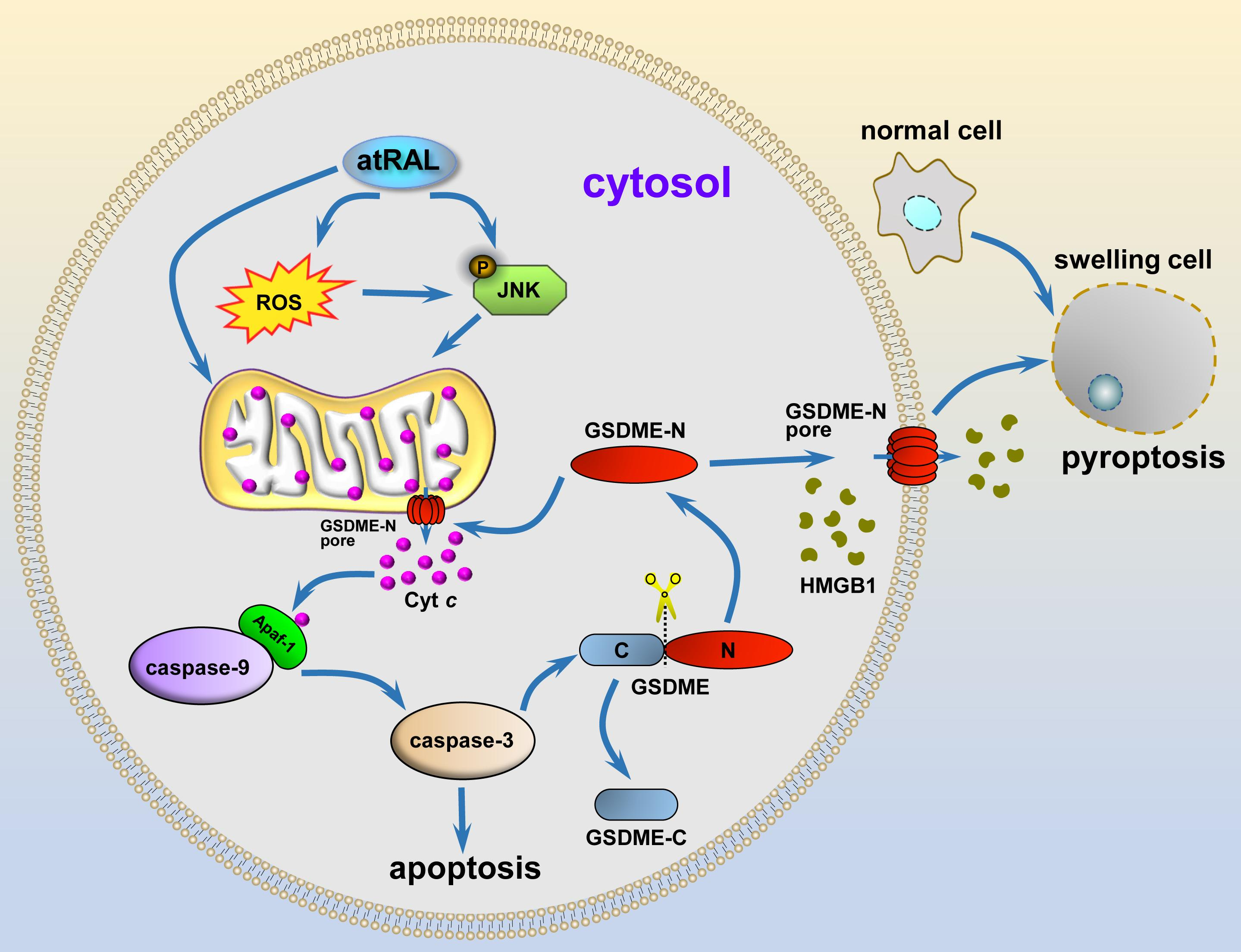 该研究创新性发现成孔蛋白Gasdermin E通过激发焦亡和恶化凋亡促使atRAL引发感光细胞的丧失,更加重要的是敲除Gsdme基因显著地减轻了atRAL积聚引发的小鼠神经视网膜退化的现象,从而揭示成孔蛋白Gasdermin E很可能成为改善干性AMD和STGD1治疗的有效靶点。此外,研究还发现atRAL诱导感光细胞的丧失与成孔蛋白Gasdermin D 和RIP3/MLKL调控的坏死性凋亡无关;JNK信号是Gasdermin E激活的关键上游之一;线粒体是Gasdermin E的攻击对象,其参与了Gasdermin E介导的感光细胞焦亡和凋亡。