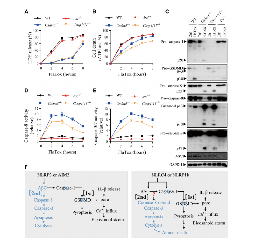 作者通过保护抗原(protection antigen: PA)把带有lethal factor N端的Flagellin(LFn-Fla)(PA+LFn简称为FlaTox)转入细胞内激活NLRC4炎症小体并通过ASC或不通过ASC招募caspase-1切割GSDMD诱导细胞发生焦亡。小鼠体内注射FlaTox确实可以导致NLRC4依赖的细胞死亡和小鼠死亡[9, 10]。论文研究结果显示,NLRC4依赖的三种细胞死亡通路以特定顺序发生:在野生型小鼠中注射FlaTox优先激活NLRC4-caspase-1途径剪切GSDMD发生焦亡并导致小鼠死亡;当第一条死亡路径被阻断(Casp1或Gsdmd基因缺失)时,会启动NLRC4-ASC介导caspase-8激活并导致细胞凋亡和小鼠死亡;当GSDMD诱导的焦亡和ASC-caspase-8诱导的凋亡两条路径都被阻断时,caspase-1会触发内源性凋亡通路并导致小鼠死亡。以上三种死亡通路中任意一条的存在都足以导致大量的细胞死亡和小鼠死亡,只有通过基因敲除阻断所有死亡途径才能彻底阻止NLRC4炎症小体介导的细胞死亡、组织损伤和小鼠死亡。该项工作还揭示了NLRC4炎症小体过度激活导致的小鼠死亡与炎症因子风暴,脂质风暴没有相关性,而与上面提及的细胞死亡有明显的相关性。此外,通过阻断这些死亡途径,哺乳动物体内繁殖缺陷性沙门氏菌(Salmonella SL7207)感染引起的小鼠死亡得到了缓解。因此,为了降低病原体感染疾病的致死率,通过控制感染病原体的繁殖和阻断细胞死亡可能是有效的策略。