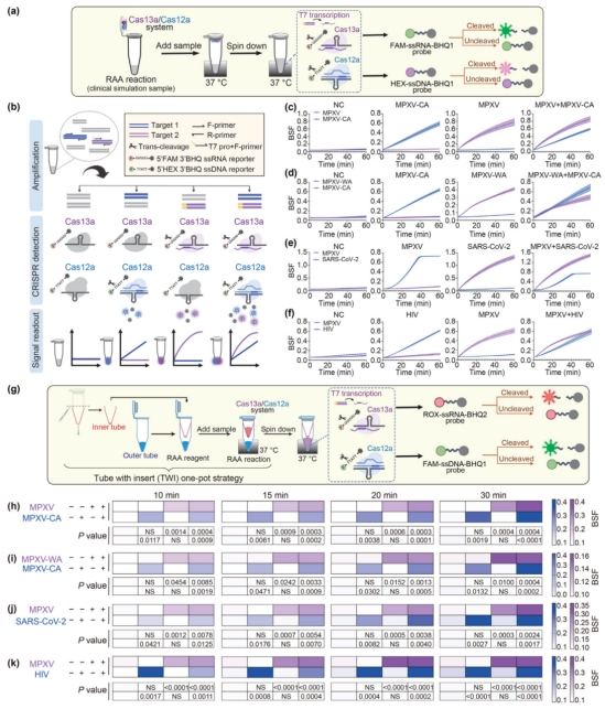 根据世界卫生组织(WHO)的流行病学数据,约有51%的猴痘病毒(MPXV)感染病例同时也被人类免疫缺陷病毒(HIV)感染。研究表明HIV和MPXV可能互相促进传播。疾病预防控制中心(CDC)强调,接受猴痘病毒感染检测的个体应同时进行HIV检测和预防服务。此外,在COVID-19疫情期间,有关猴痘病毒和严重急性呼吸综合症冠状病毒2(SARS-CoV-2)共感染发病率案例逐渐增加。多重检测涉及同时检测多个基因或靶标,是最大限度降低假阴性结果风险的可靠方法。该团队成功开发了基于RAA-Cas12a/Cas13a的双靶点检测方法。 通过结合Cas12a和Cas13a系统并优化反应设置,该团队证明了该方法能够检测单个样本中MPXV的两个基因靶标。双靶标检测分析能够在RAA后10分钟内区分MPXV-CA和MPXV-WA进化枝。此外,考虑到检测MPXV与SARS-CoV-2或HIV等合并感染对于有效治疗和疾病预防的重要性,该团队的双靶点检测方法展示了其同时检测MPXV与SARS-CoV-2的效率。这种多重检测方法不仅提供了一种快速且经济有效的方法来检测MPXV并区分其进化枝,提供了检测合并感染的能力。
