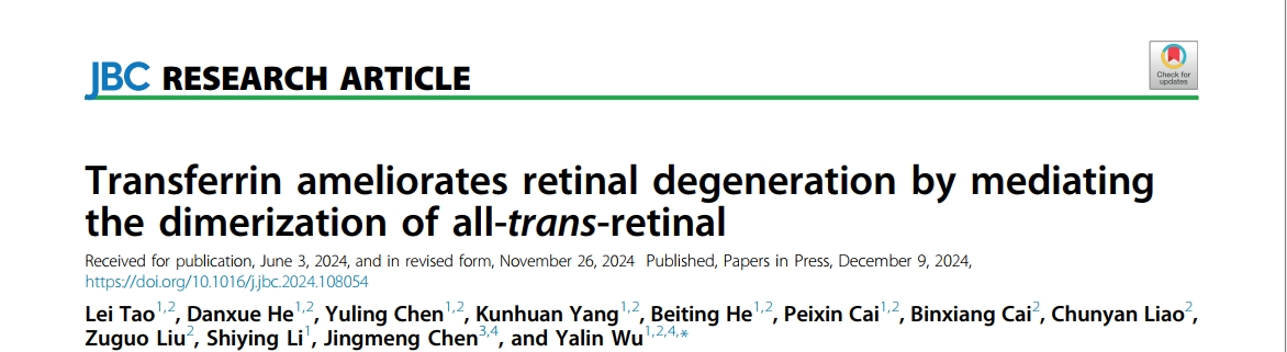 近日,国际权威TOP期刊《Journal of Biological Chemistry》在线发表了吴亚林教授课题组的最新研究成果,题为“Transferrin ameliorates retinal degeneration by mediating the dimerization of all-trans-retinal”。该工作揭示了转铁蛋白(transferrin)可通过“原位”调控视觉循环紊乱缓解视网膜黄斑变性,进而有望推动常染色体隐性Stargardt病(STGD1)和干性年龄相关性黄斑变性(AMD)新治疗策略的形成。本论文的第一作者是医学院博士研究生陶磊(现为宁波大学附属第一医院住院医师),通讯作者是吴亚林教授。