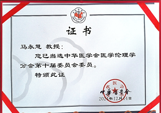 中华医学会医学伦理学分会于2024年12月14日在北京举行第十届委员会换届大会。我院马永慧副教授当选为中华医学会医学伦理学分会第十届全国委员。