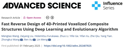 日前,许韧教授团队联合日本立命馆大学孟林团队提出了一种创新的优化方法,结合深度学习(DL)与进化算法(EA),以溶剂响应水凝胶为研究对象,实现了高效、精准的4D打印优化设计。论文发表于国际知名杂志Advanced Science。