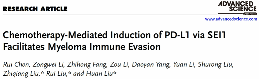 近日,刘欢教授团队在探索化疗药物诱导骨髓瘤免疫逃逸方向取得新进展,相关成果以题为“Chemotherapy-mediated induction of PD-L1 via SEI1 facilitates myeloma immune evasion”发表于Advanced Science杂志。