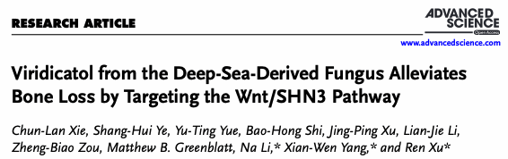 近日,医学院许韧教授团队与海南医科大学杨献文研究员团队在Advanced Science杂志发表论文"Viridicatol from the Deep-Sea-Derived Fungus Alleviates Bone Loss by Targeting the Wnt/SHN3 Pathway",首次揭示深海真菌来源的喹诺酮类化合物Viridicatol(VDC)在骨代谢调控中的重要作用及其分子机制。研究团队采用碱性磷酸酶(ALP)活性作为成骨矿化活性的评价指标,对251种深海真菌来源的化合物进行了系统性筛选,成功鉴定出19种具有显著促骨形成活性的候选分子。其中,化合物VDC展现出尤为突出的成骨活性,并表现出对Hivep3基因的特异性抑制作用。机制研究表明,VDC能够直接靶向结合SHN3蛋白并抑制其功能,通过调控Wnt/SHN3信号通路显著促进骨形成。这一作用在骨质疏松、骨折小鼠和成骨不全小鼠模型中得到了充分验证。