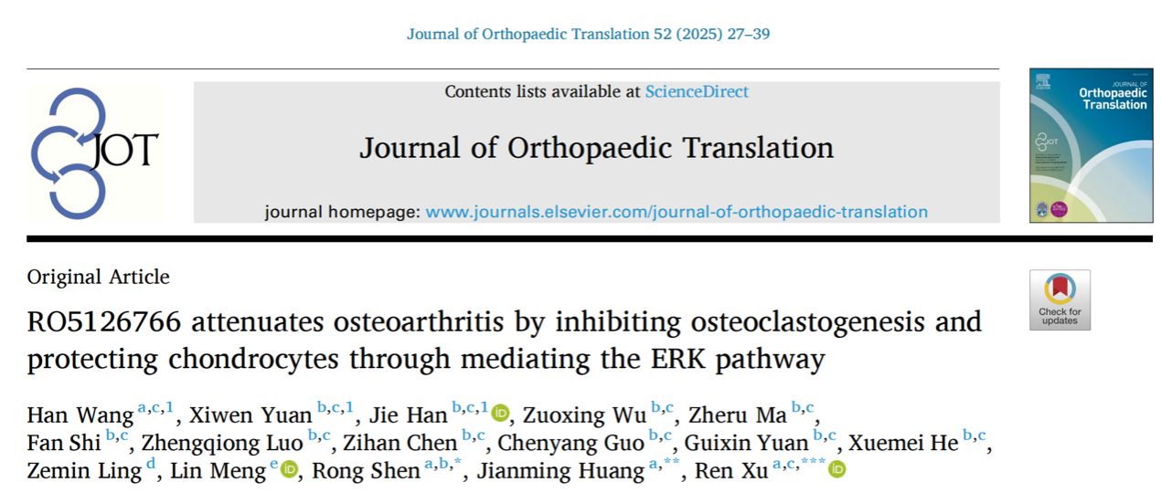 近日,OD网页版,OD(中国)许韧教授团队在骨关节炎(Osteoarthritis, OA)治疗研究中取得重要进展。研究发现,小分子化合物RO5126766(RO)通过抑制ERK信号通路,显著减轻骨关节炎的病理进程,相关成果以题为《RO5126766 attenuates osteoarthritis by inhibiting osteoclastogenesis and protecting chondrocytes through mediating the ERK pathway》发表于国际权威期刊《Journal of Orthopaedic Translation》。