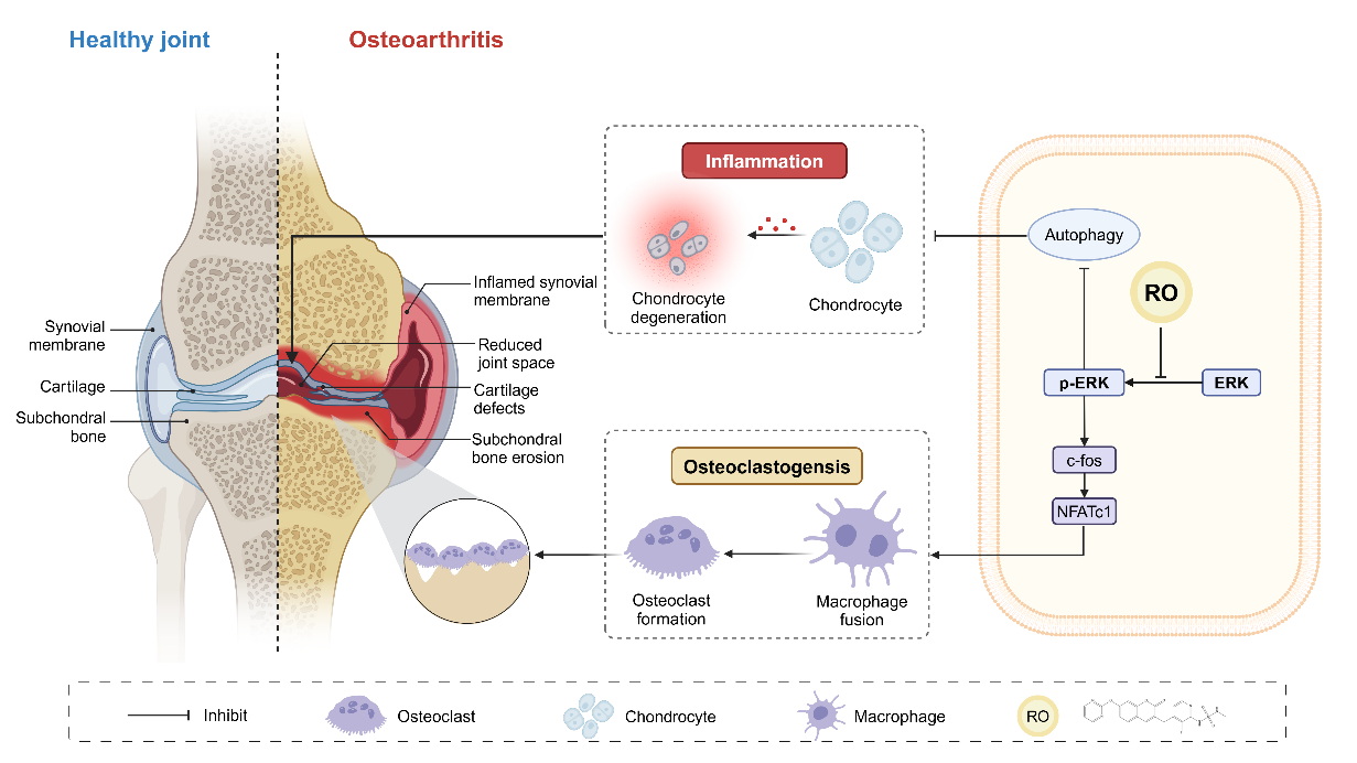 许韧教授团队的研究提示RO可能通过双重作用缓解OA进展:一方面抑制ERK/c-fos/NFATc1信号轴的激活,有效阻断破骨细胞融合过程,减轻软骨下骨侵蚀;同时通过抑制ERK信号通路的激活恢复软骨细胞自噬水平,延缓软骨基质退变进程,维持软骨细胞代谢稳态。该研究为开发新型OA治疗方法奠定了重要的理论基础。
