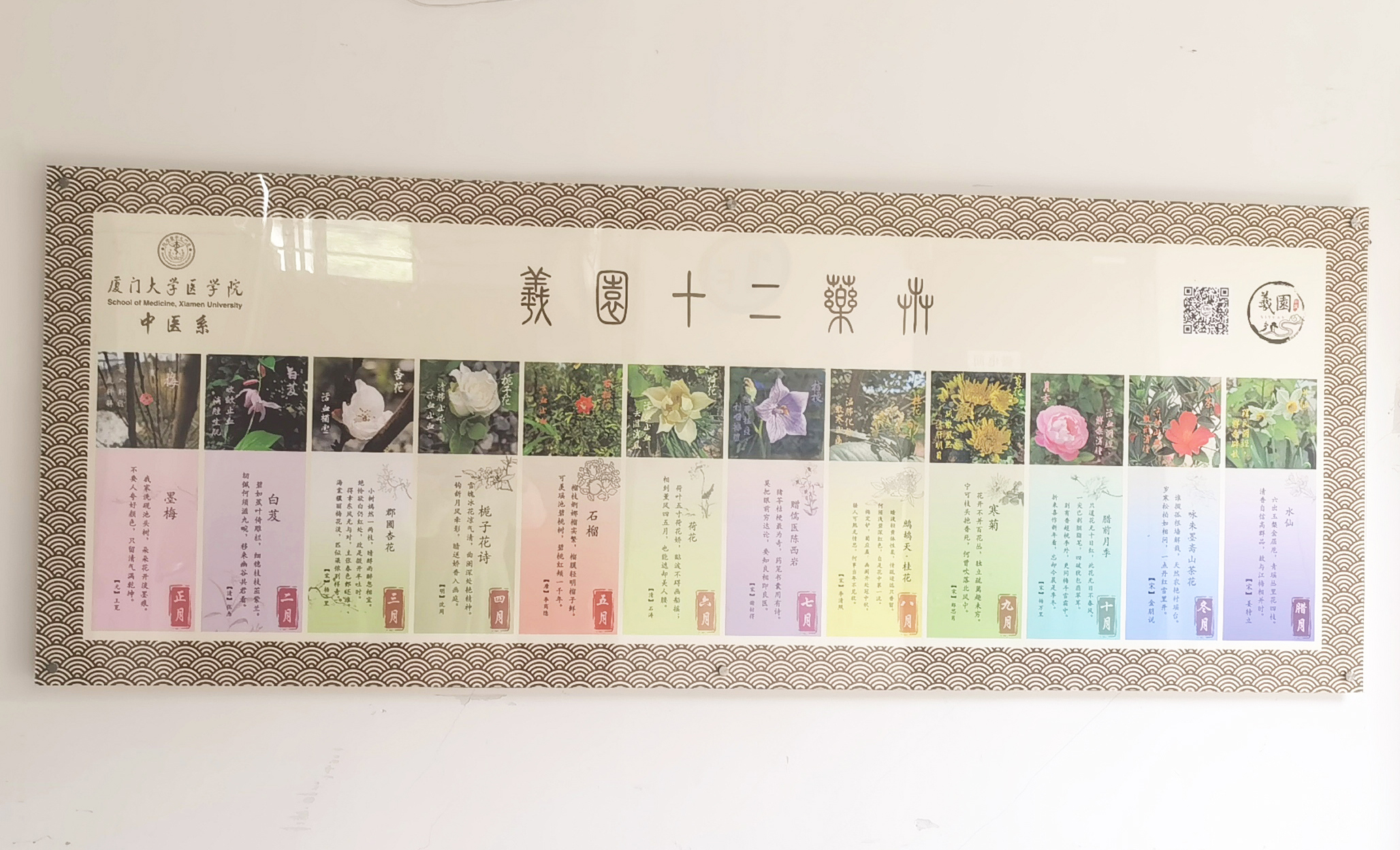 药用花卉是指医学上用于防病、治病的花卉植物,生活中常见的玫瑰、月季、芍药、栀子、百合、桂花等不仅美化着人们的生活,陶冶着人们的情操,而且还具有较高的药用价值。我国是花卉文化的发源地,借花明志或阐述人生哲理、赋予某些花卉以一定的寓意用以表示人们美好的祝福和愿望等是花卉文化的主要表现形式。羲园十二药卉是中医系师生将中国传统十二花神和厦门地区适宜种植的花卉植物相结合,遴选出来的于相应月份开花的十二种具有药用功效的花卉植物,已经以月份海报的形式在公众号相应栏目进行了持续一年的推送,并制作成展板装饰爱礼楼楼道。本次羲园十二药卉定制鼠标垫就是在此基础上设计制作而成。
