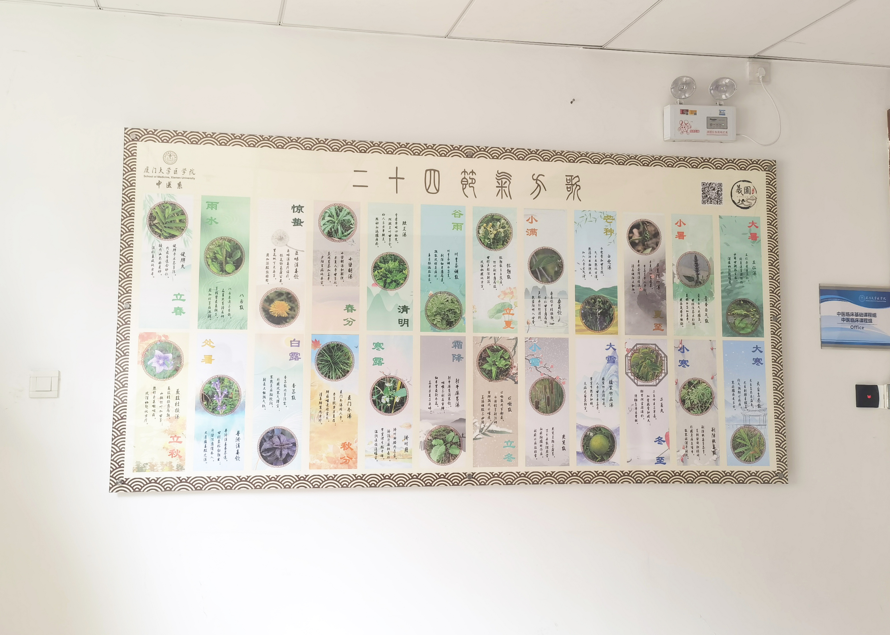 二十四节气是中华民族悠久历史文化的重要组成部分,是上古农耕文明的产物,它是上古先民顺应农时,通过观察天体运行,认知一岁中时令、气候、物候等变化规律所形成的知识体系,蕴含着悠久的文化内涵和历史积淀。羲园二十四节气方歌是中医系师生在观察不同节气长势较好的药用植物基础上,遴选出来的包含有该药用植物的常用方剂方歌,已经以节气海报的形式在公众号相应栏目进行了持续一年的推送,同样也制作成展板装饰爱礼楼楼道。本次羲园二十四节气方歌书签就是在此基础上设计制作而成。书签背面是医圣张仲景的名言“勤求古训,博采众方”和医学院院训“仁心仁术 止于至善”。