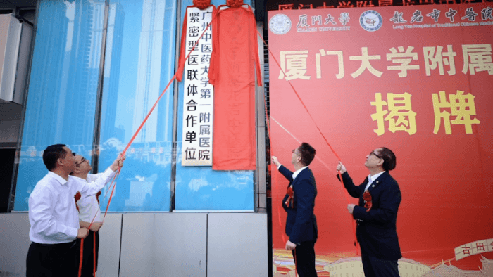 周大旺副校长、韩家淮院士、杨溢部长、龙岩市中医院郭伟院长共同为厦门大学附属龙岩中医院揭牌。