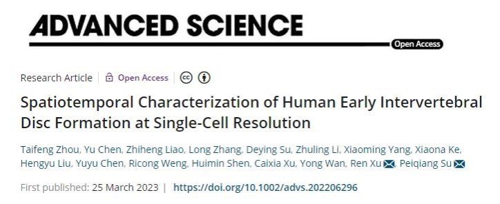 2023年3月25日,我院许韧教授课题组与中山大学附属第一医院的苏培强教授团队合作在国际权威杂志Advanced Science上发表题为“Spatiotemporal characterization of human early intervertebral disc formation at single-cell resolution”的研究论文,首次建立了人类和小鼠早期椎间盘形成的时空转录图谱,为从发育角度探索IVD退变的再生治疗策略提供了全新研究视角。