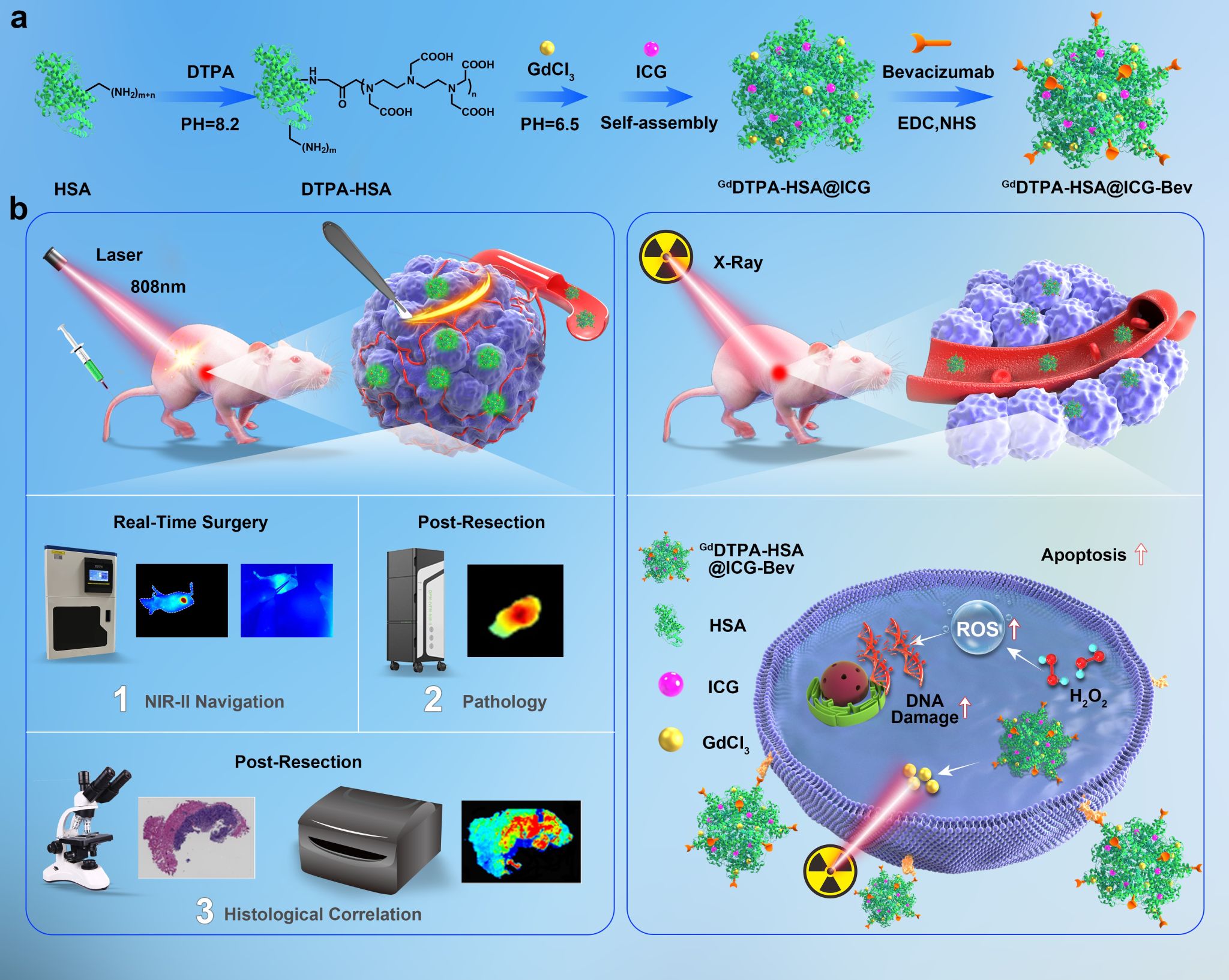 张教授团队长期致力于乳腺癌精准诊疗研究,为解决上述临床“难点”和“痛点”,该研究通过多学科交叉合作,巧妙地利用临床安全可及的试剂:吲哚菁绿(ICG)、钆螯合剂、人血白蛋白(HSA)和贝伐单抗,通过自组装合成了一种新型、安全、多功能纳米探针GdDTPA-HSA@ICG-Bevacizumab (NPs-Bev)。研究显示这一新型探针对高表达VEGF-A的乳腺癌细胞系及荷瘤小鼠具有高度特异的肿瘤靶向性;可提高近红外二区荧光成像引导乳腺癌手术的精准性,引导术者对荷瘤小鼠进行精准的外科手术切除,显著提高了无复发生存率(P = 0.0085)。为进一步模拟人乳腺癌发病模式,该研究发现该探针可精准地识别MMTV-PyVT自发性乳腺癌转基因小鼠的癌组织。此外,该探针可增强X线对乳腺肿瘤的杀伤作用,诱导更多的活性氧(ROS),增强放疗敏感性并显著抑制小鼠乳腺肿瘤的生长。最后,在小鼠水平的研究提示该新型探针的生物相容性好、无明显毒副作用,可安全应用于体内研究。尤为重要的是,张教授团队构建的新型乳腺癌手术导航体系,具有临床转化的潜在优势,目前正加速该体系的临床转化,未来有望将该新型体系应用于乳腺癌保乳手术导航或放疗增敏的临床实践,造福广大的乳腺癌患者。