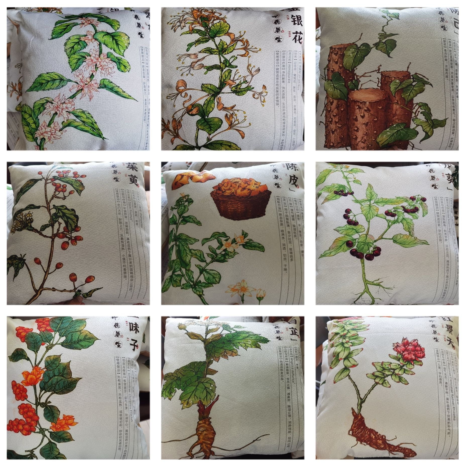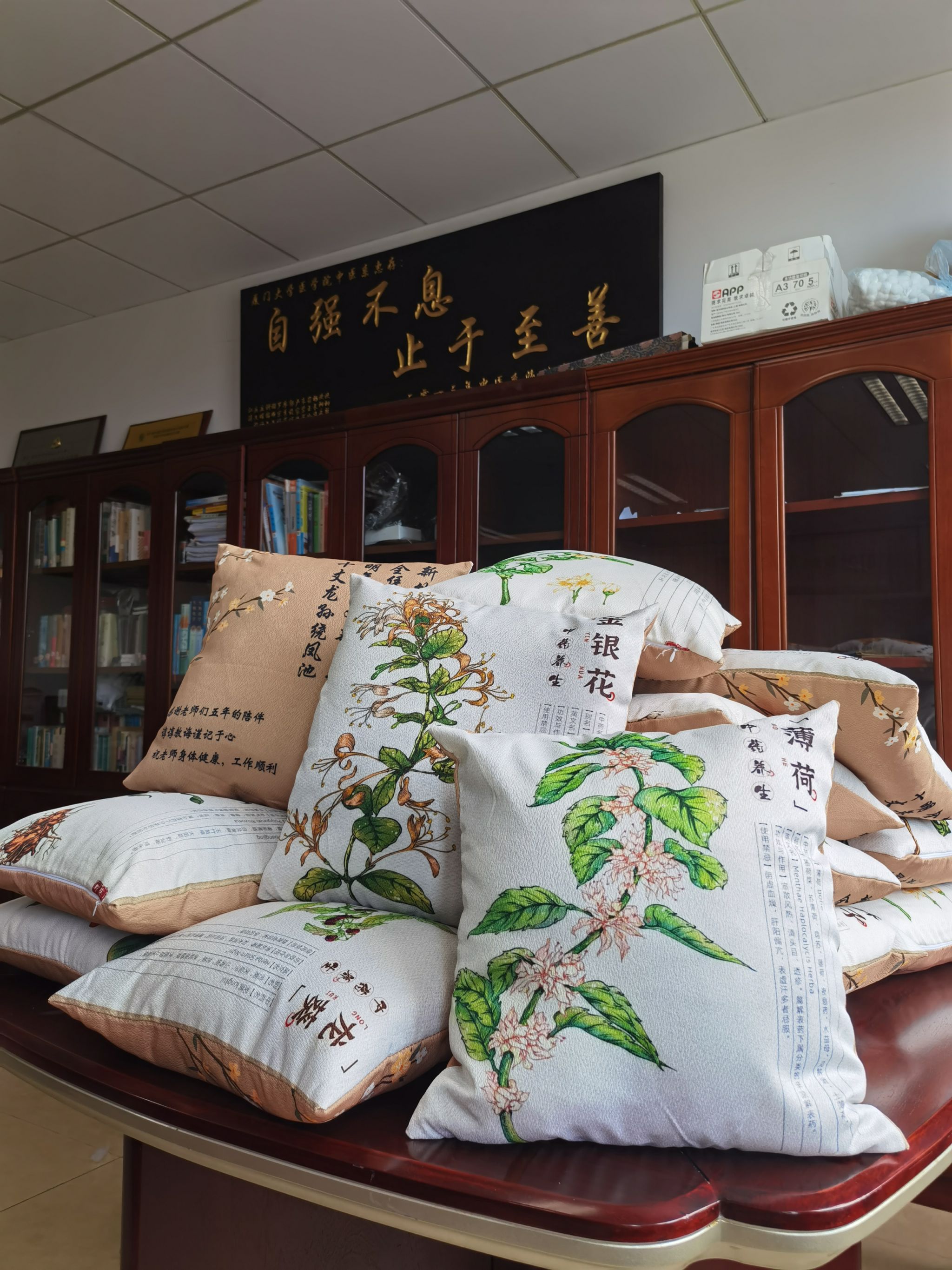 此次回赠给老师的礼物,是2017级中医一班同学特别为中医系老师定制的中药抱枕。每个抱枕均以一味中药为主题,抱枕正面印有中药名、别名、药材来源、性味功效、药用价值、使用禁忌等内容,并附有药图。涉及的中药有薄荷、五味子、龙葵、红景天、陈皮、金银花等。