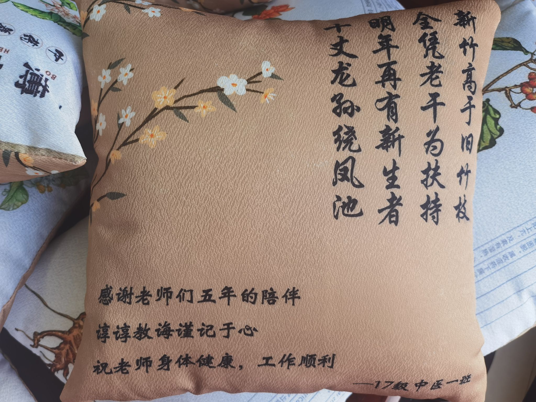 抱枕背面右上角印有清代诗人郑板桥《新竹》一诗:“新竹高于旧竹枝,全凭老干为扶持。明年再有新生者,十丈龙孙绕凤池。”不仅表达了后辈不忘前辈扶持教导之恩,也展现了中医后辈新生力量将更好更强大的美好愿景。左下角附上2017级中医一班对中医系老师的感恩与美好祝福。