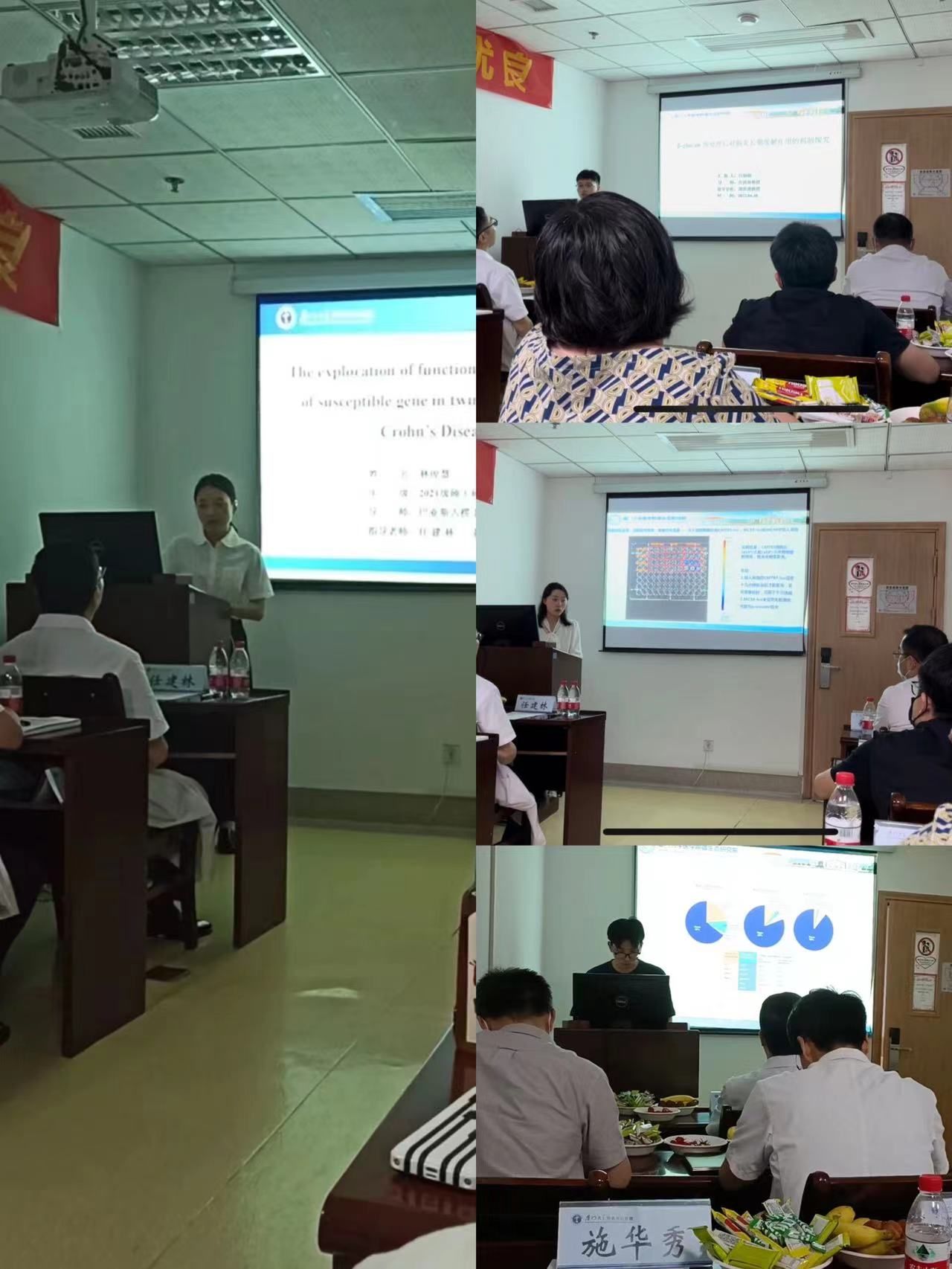 首先蔡英博士、吕银银博士等九位研究生依次进行学位论文开题答辩,课题题目包括“念珠菌来源的β-glucan预处理对结肠癌肝转移的影响”、“β-glucan预处理对肠炎长期缓解作用的机制探究”、“唾液链球菌代谢产物抑制结直肠癌的作用与机制”、“特定菌群调控宿主基因、免疫状态影响结直肠癌的发生发展”、“人工智能辅助CT小肠造影评估克罗恩病”等。上述课题在四位双聘教授指导下,紧密围绕学科“肠道微生态”和“人工智能”与消化系统重大疾病防治研究这两个中心,重点聚焦特定肠道微生物及其代谢产物在炎症性肠病、结肠肿瘤发生发展中作用,人工智能辅助炎症性肠病评估和消化系肿瘤早诊早治等研究。